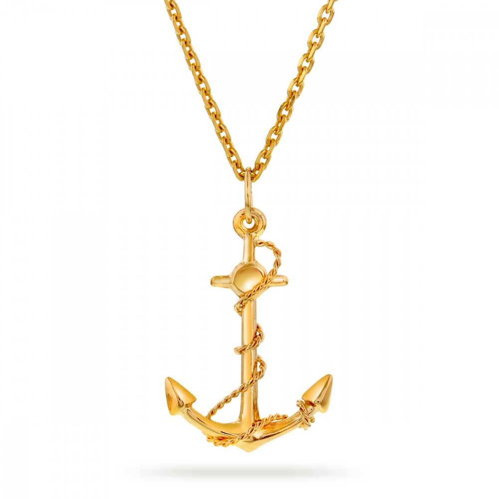 Klassisk sjømanns-anker i gult gull. Høyde 23 mm. Forgylt ankerkjede 50 cm medfølger.