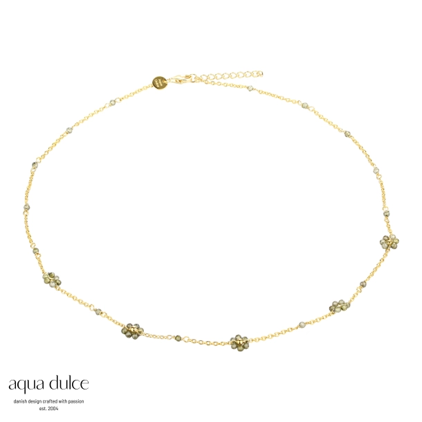 Halskjede i gullbelagt sterlingsølv med olivenblomst og små gullkuler.