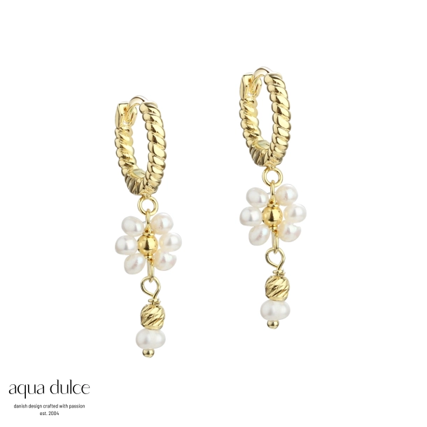 12 mm. kreoler i gullbelagt sterlingsølv med hvite ferskvannsperleblomster, vridde kuler og perler.