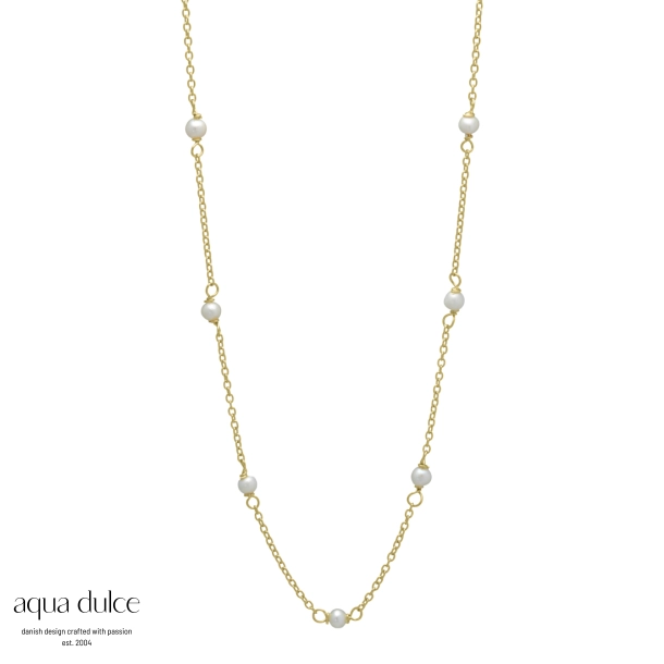Pearly er et vakkert halskjede i gullbelagt sterlingsølv med små fine hvite ferskvannsperler. Sett den sammen med for eksempel armbåndet Pearly, som også har fine små ferskvannsperler.