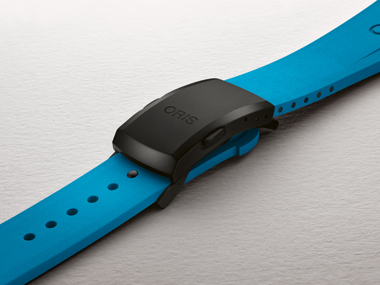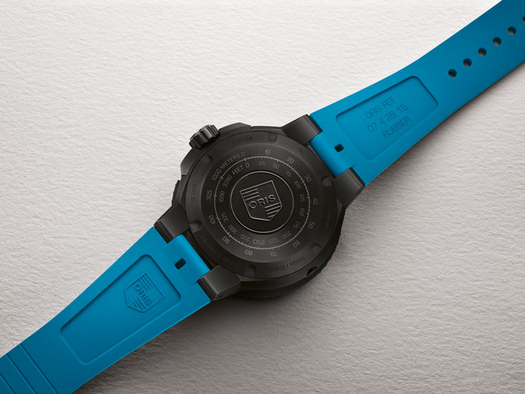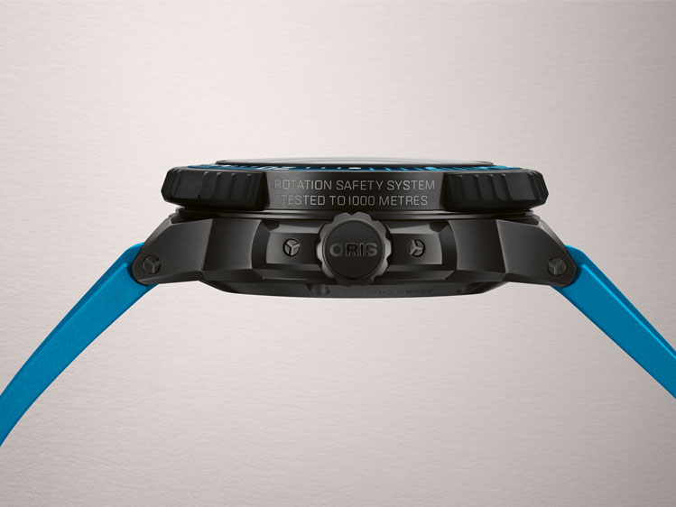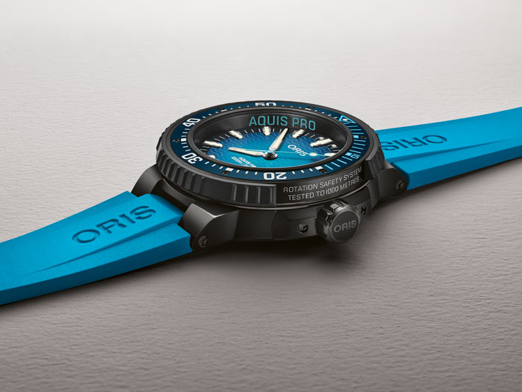 Oris «Pro» dykkerklokke er full av detaljer. Den grå PVD belkagte titan urkassen er lett og motstandsdyktige, RSS bezel system, låser bezelen for sikker dykketid, og uret leveres både med en frisk blå og en svart gummirem. Uret tåler opp til 100 bar, 1000m vanntetthet. Keramisk minutt skala bezel innlegg. Buet safirglass på begge sider,og dobbelsided anti-refleks behandlet.