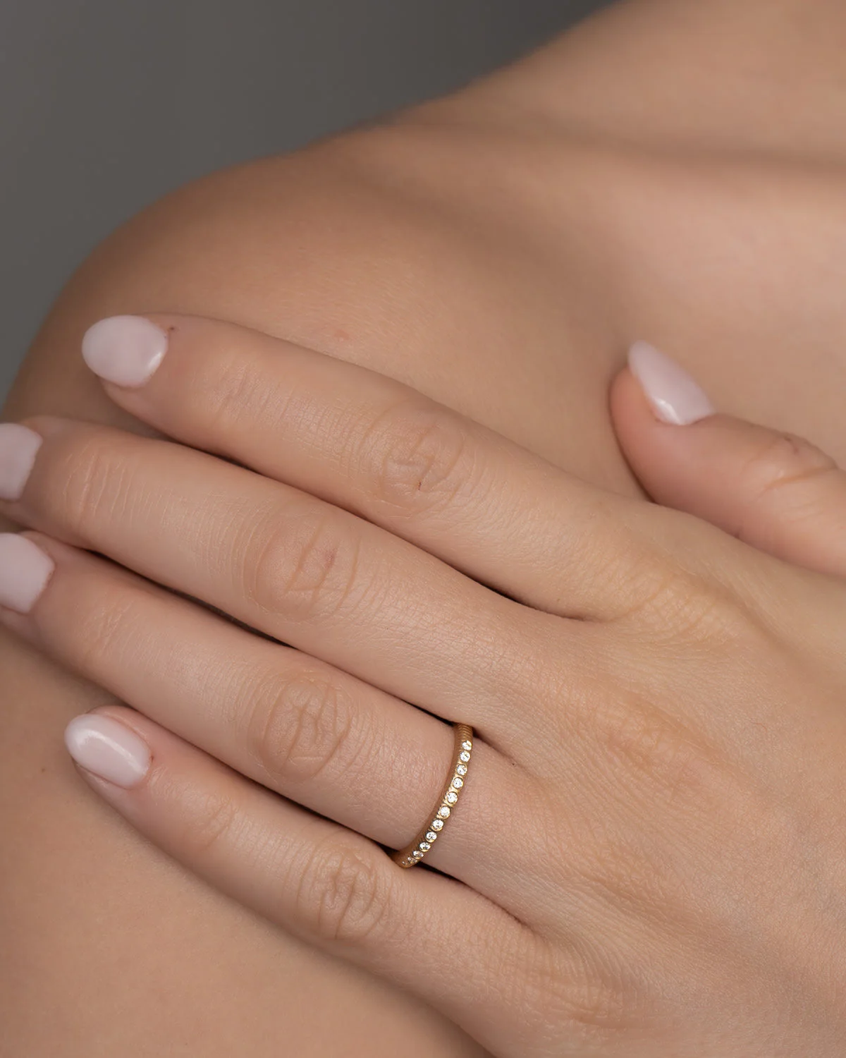 En Curve ring med brillanter er en tradisjonell vielsering med en utradisjonell finish. Hver ring er laget for hånd med Dulongs håndfilte, riflede signaturoverflate på yttersiden. Innsiden er blankpolert, så ringen er behagelig og lett å ta av og på.