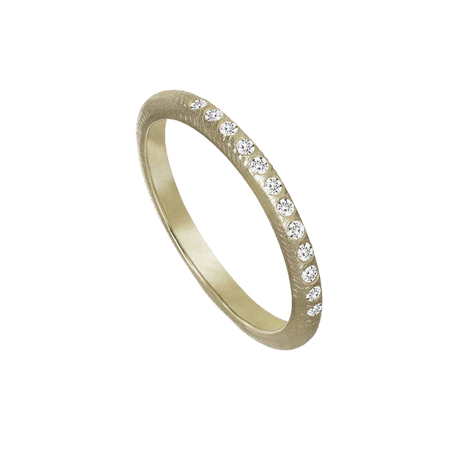 En Curve ring med brillanter er en tradisjonell vielsering med en utradisjonell finish. Hver ring er laget for hånd med Dulongs håndfilte, riflede signaturoverflate på yttersiden. Innsiden er blankpolert, så ringen er behagelig og lett å ta av og på.