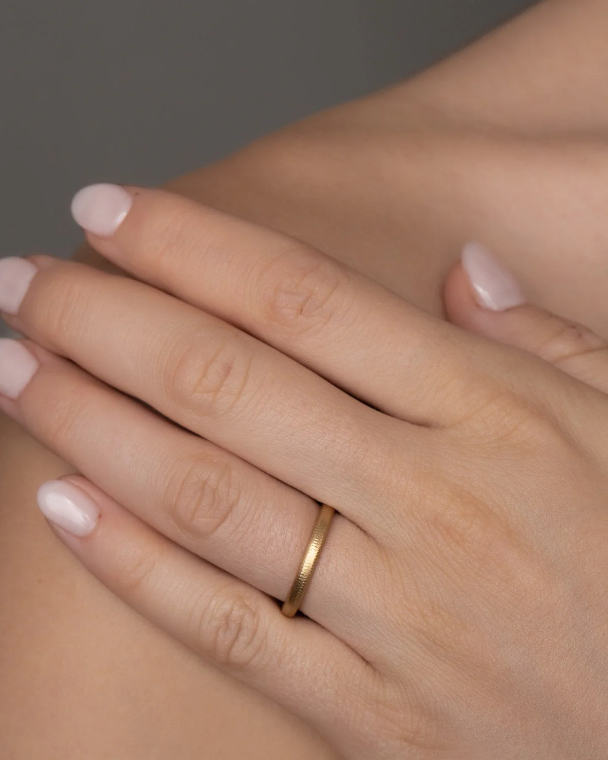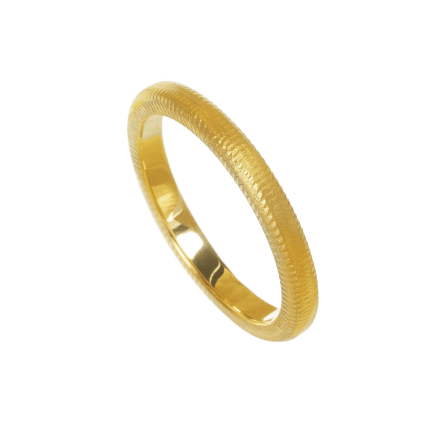 En Curve ring med brillanter er en tradisjonell vielsering med en utradisjonell finish. Hver ring er laget for hånd med Dulongs håndfilte, riflede signaturoverflate på yttersiden. Innsiden er blankpolert, så ringen er behagelig og lett å ta av og på.