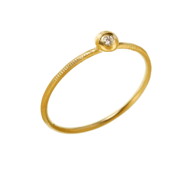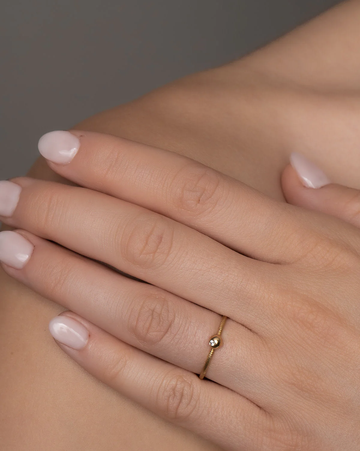 Delphis ringenes spesielle uttrykk er lett og elegant, hvilket gjør dem feminine og klassiske. Denne flotte Delphis ring har 1 fin, liten kule med en brillant, som skaper et raffinert lysglimt, når hånden beveges. Gullsmedene har håndfilt overflaten og skapt en kontrast til de den fine kulen , som står i høyglans, så de reflekterer lyset.