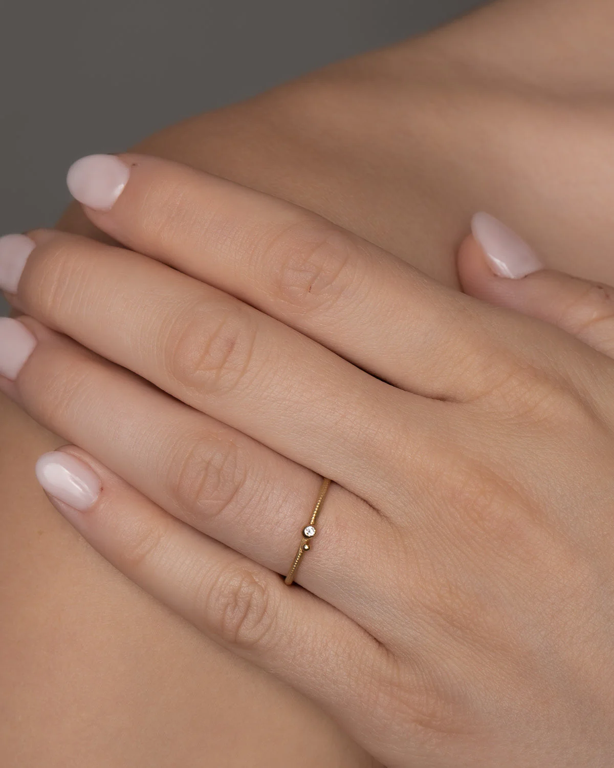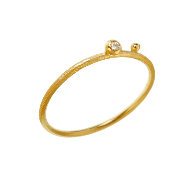 Delphis ringenes spesielle uttrykk er lett og elegant, hvilket gjør dem feminine og klassiske. Denne flotte Delphis ring har 1 fin, liten kule og en brillant, som skaper et raffinert lysglimt, når hånden beveges. Gullsmedene har håndfilt overflaten og skapt en kontrast til de den fine kulen  , som står i høyglans, så de reflekterer lyset.