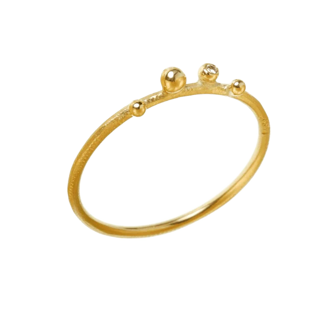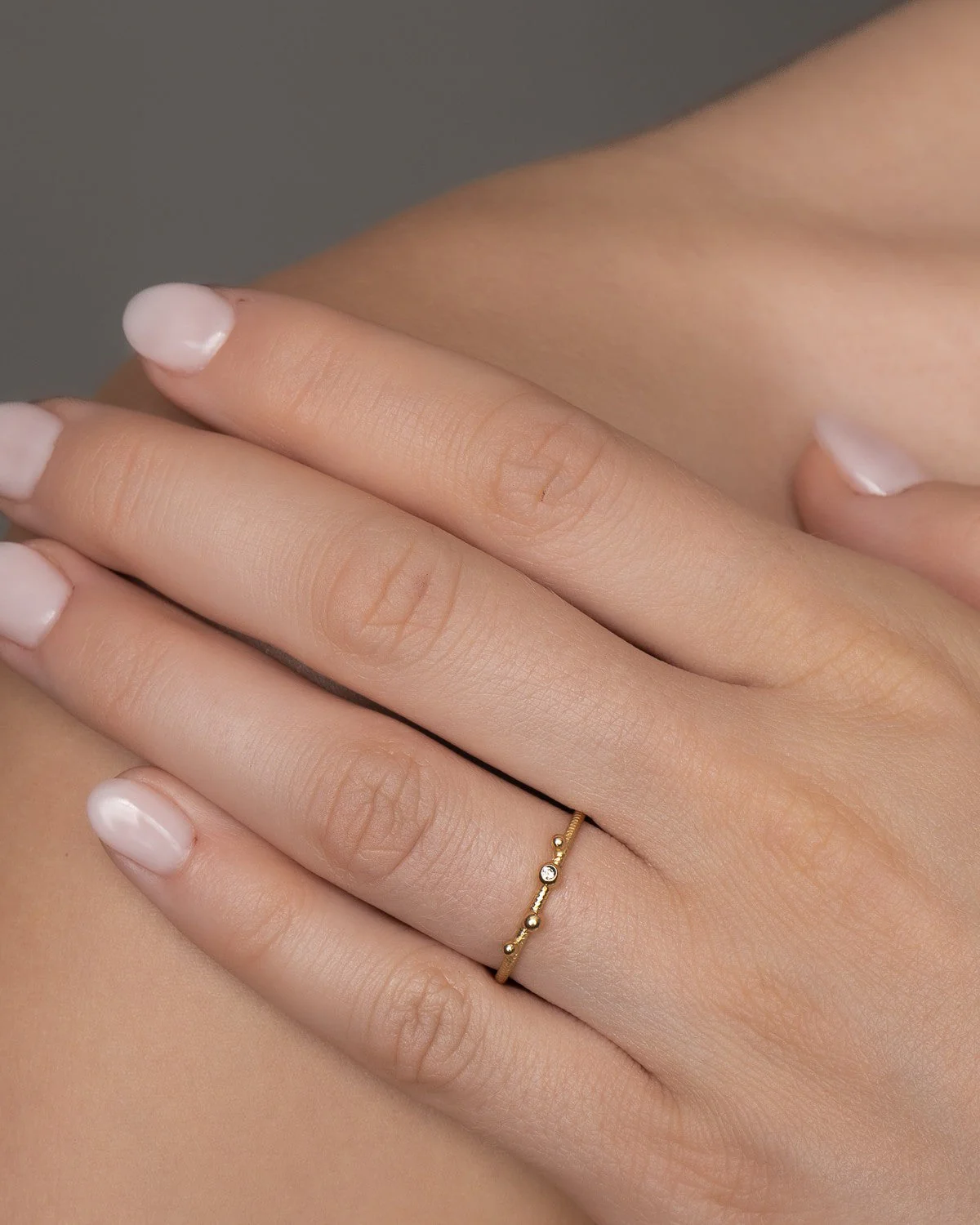 Delphis ringenes spesielle uttrykk er lett og elegant, hvilket gjør dem feminine og klassiske. Denne flotte Delphis ring har fire fine, små kuler, som skaper et raffinert lysglimt, når hånden beveges. Gullsmedene har håndfilt overflaten og skapt en kontrast til de tre fine kulene, som står i høyglans, så de reflekterer lyset.