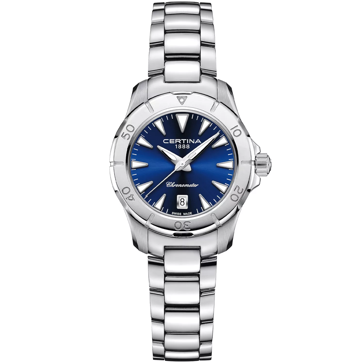 DS Action Lady lever opp til sitt navn, med en COSC- sertifisert quartz chronometer urverk som sikrer maksimal nøyaktighet sammen med en urkasse som er vanntett ned til 300m. En fantastisk blåfarget urskive gir uret et sporty og ungdommelig preg.