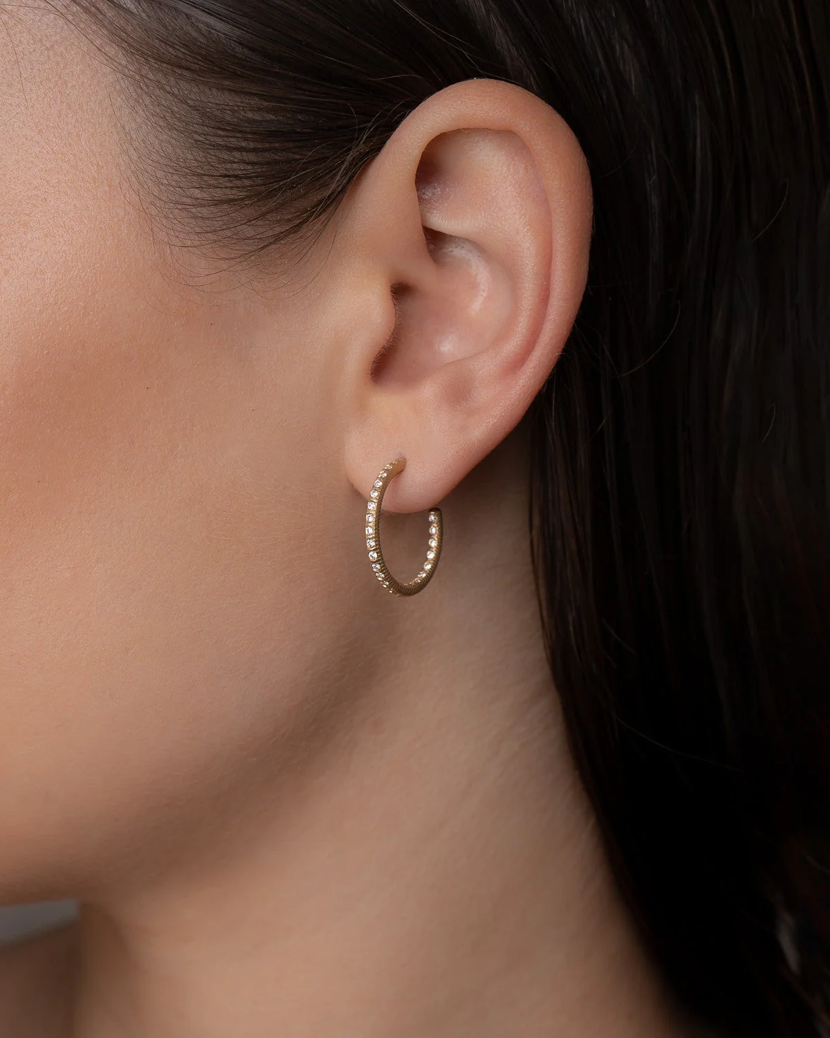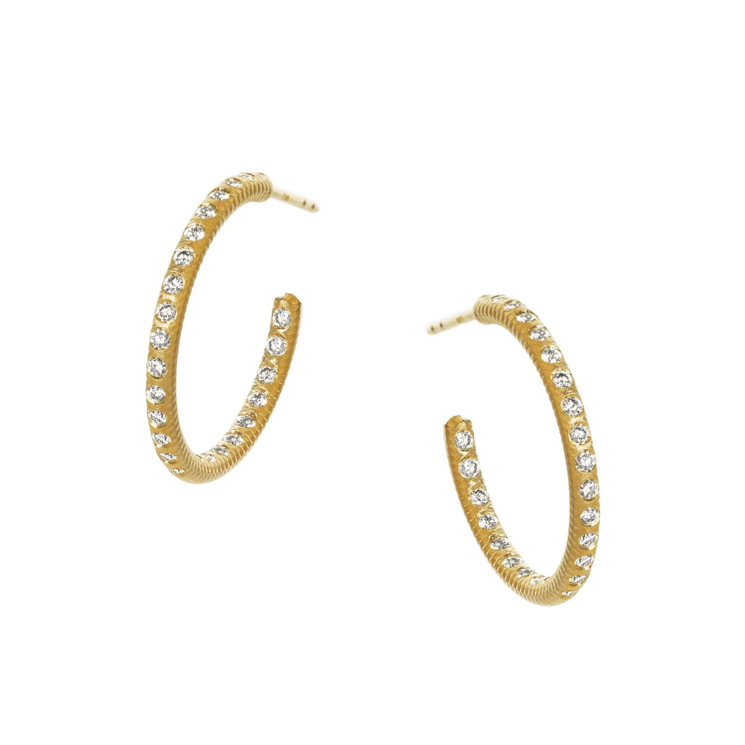 Klassiske, eksklusive creoler øreringer i 18K gull. Hver ørering er besatt med 50 brillantslipte diamanter, plassert på øreringenes ytterside forrerst og på innsiden bakerst, så lyset reflekteres flott til ditt ansikt. Øreringene er håndfilte og har en rå, riflet overflate.