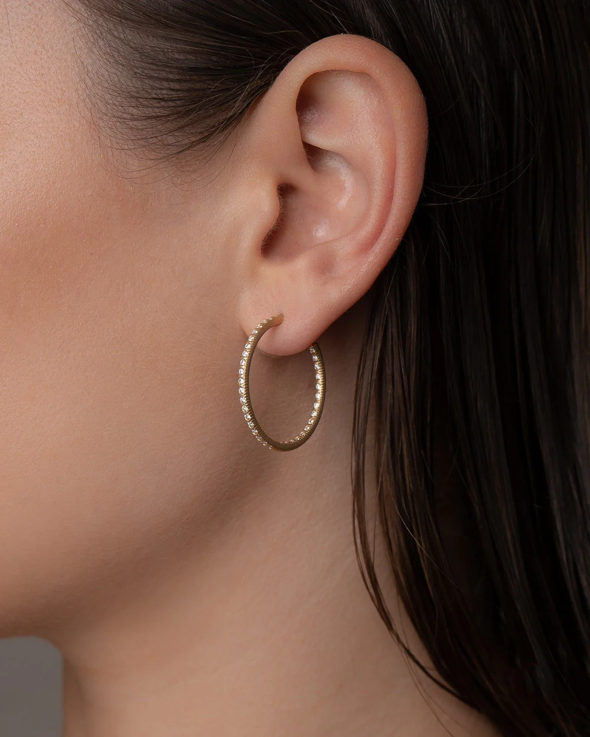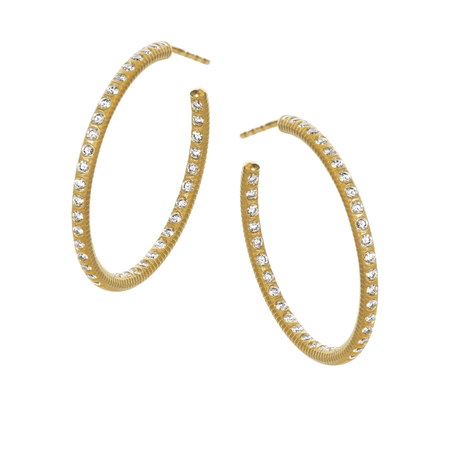 Klassiske, eksklusive creoler øreringer i 18K gull. Hver ørering er besatt med 37 brillantslipte diamanter, plassert på øreringenes ytterside forrerst og på innsiden bakerst, så lyset reflekteres flott til ditt ansikt. Øreringene er håndfilte og har en rå, riflet overflate.