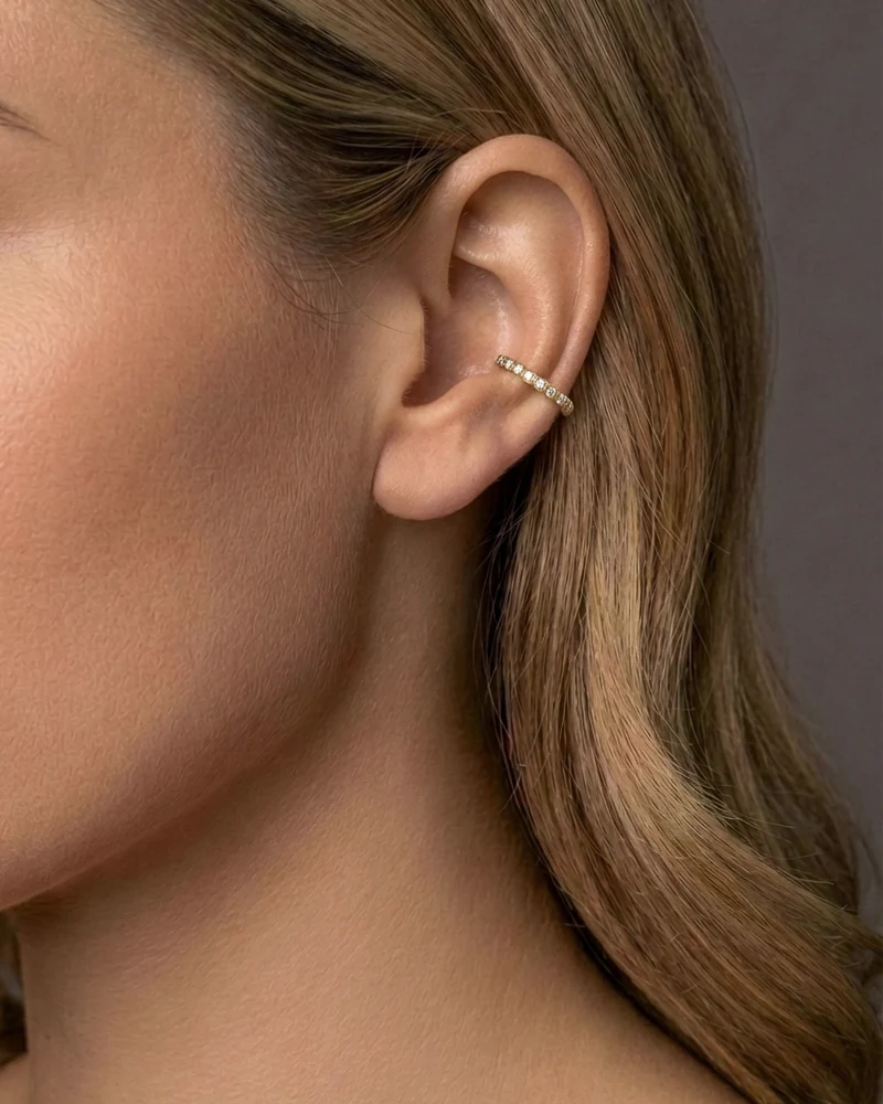 Esme Diamond Cuff i 18K gull med 20 brillantslipte diamanter, i alt 0,10 ct. Den minimalistiske, skulpturelle formen hviler letl langs øret og tilføyer en diskret linje av lys, som også komplementerer andre smykker.