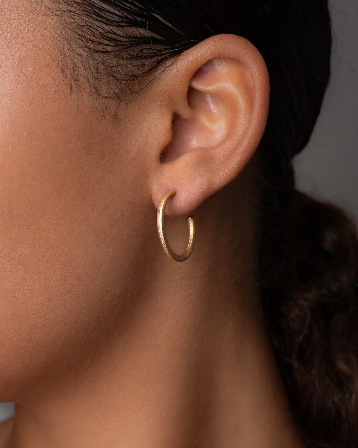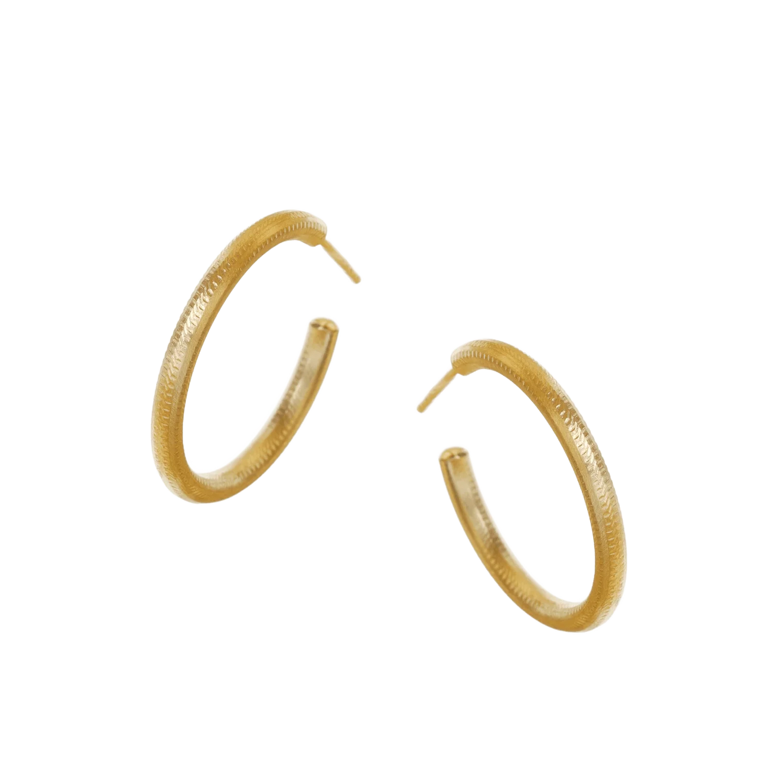 Klassiske, eksklusive creoler øreringer i 18K gull. Øreringene er håndfilte og har en rå, riflet overflate.
