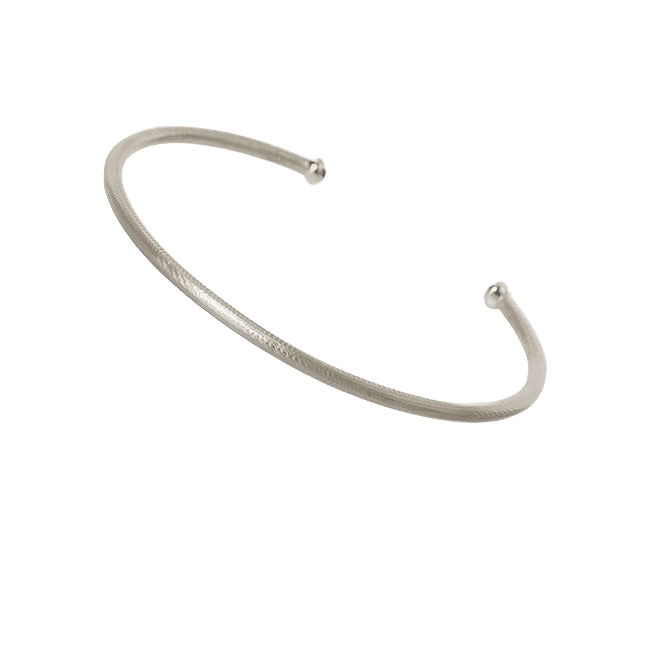 Esme armringens overflate framstår med en fasettert og riflet tekstur. Den ovale form følger håndleddet, mens de to blankpolerte kuler i endene gjør armbåndet lett og behagelig å ta av og på.