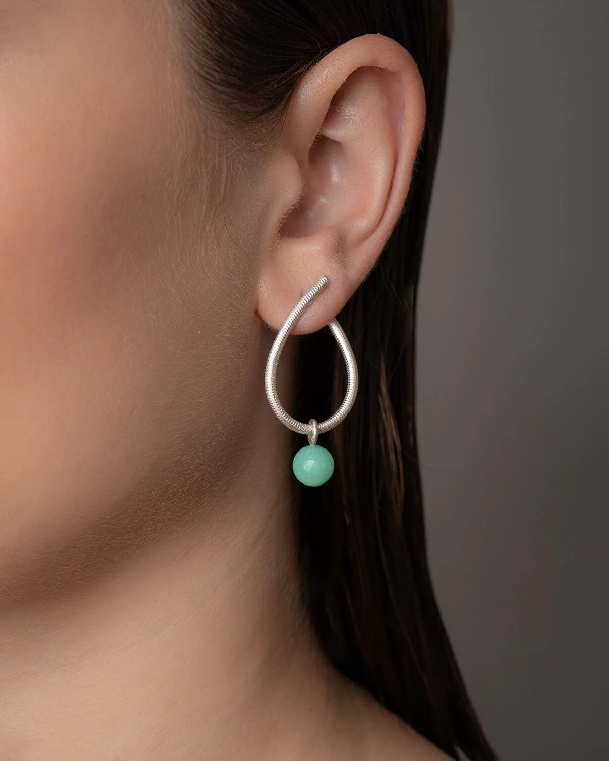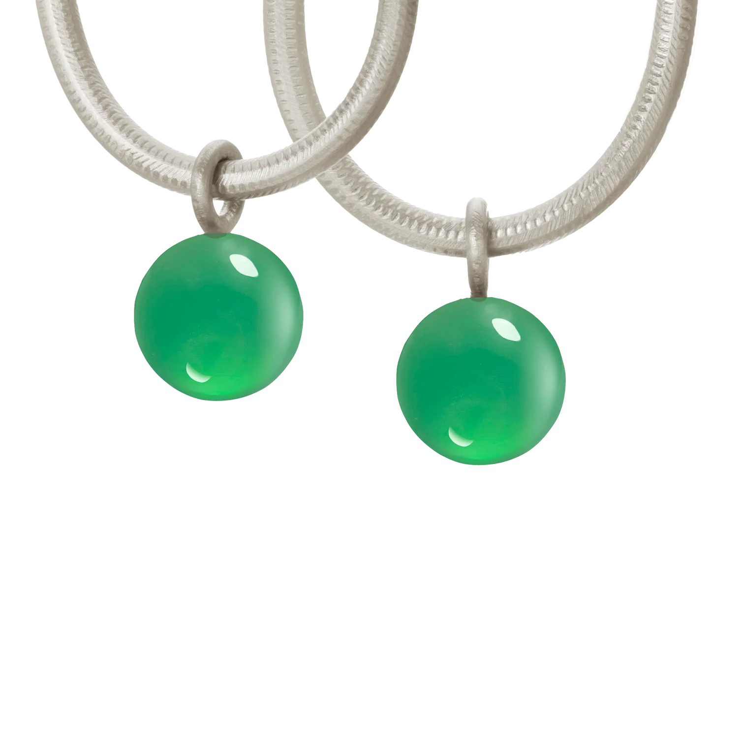 Globe anheng i sølv med den intense og klare, grønne krysopras. Chrysoprasen og sølvets klare farger skaper en flott og lekende kontrast, som framhever hudens naturlige glød.