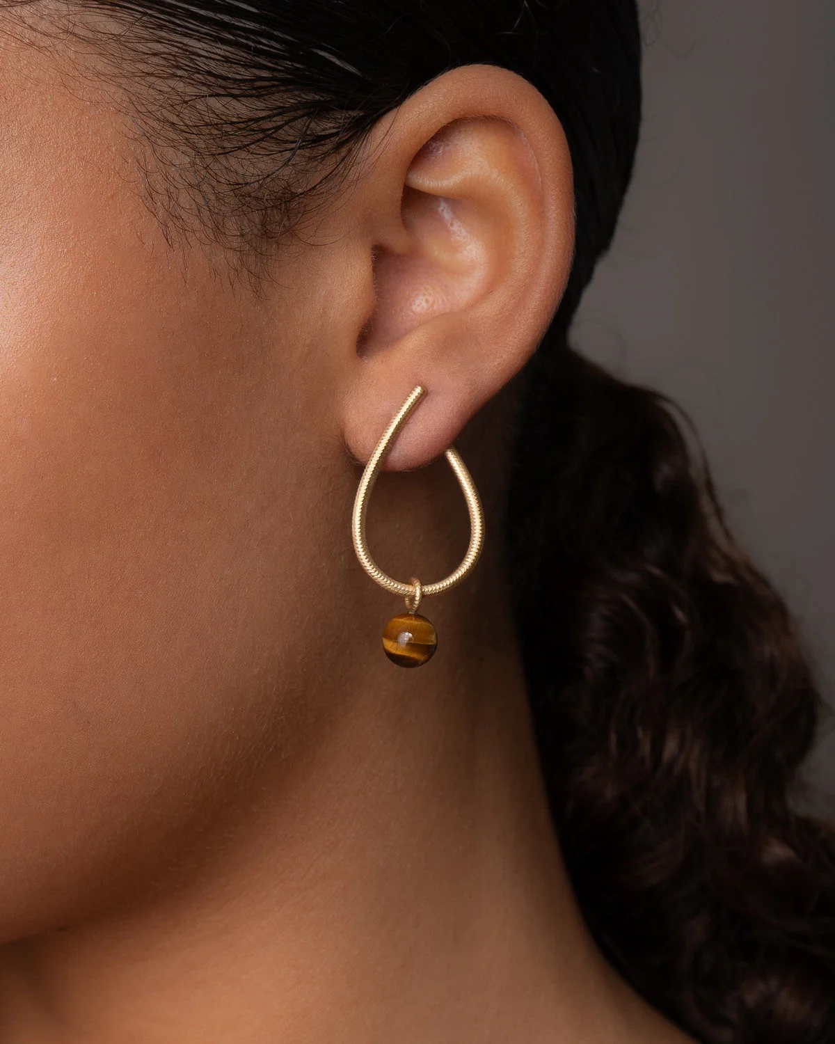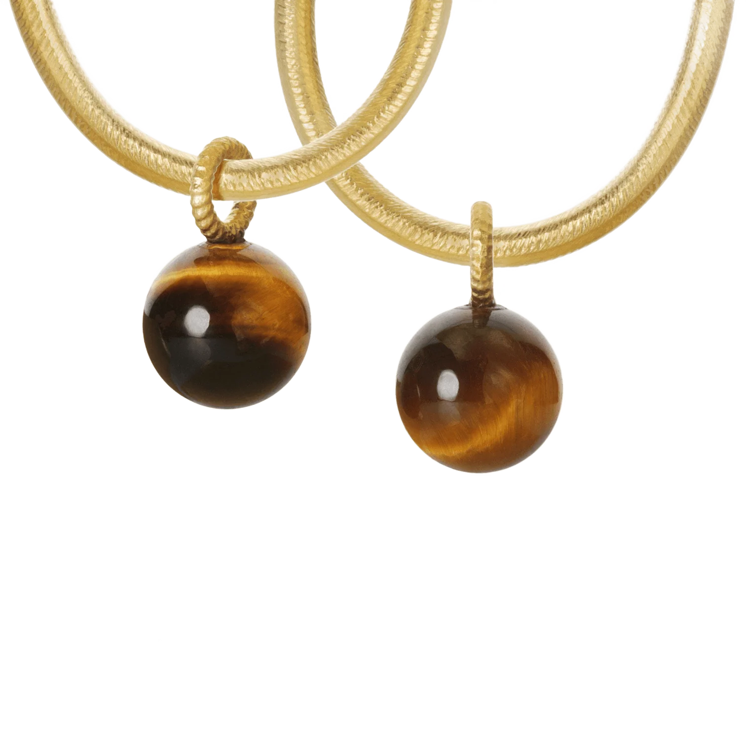 Globe anheng i gull med edelstenen tigerøye. Den har dybe nesten hypnotisk sorte, brune og orange farger med noe markant lysebrun, som er så uimotståelig dramatiske, at de nettopp ligner et tigerøye.