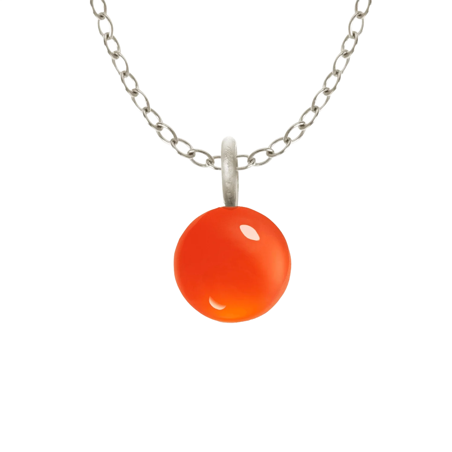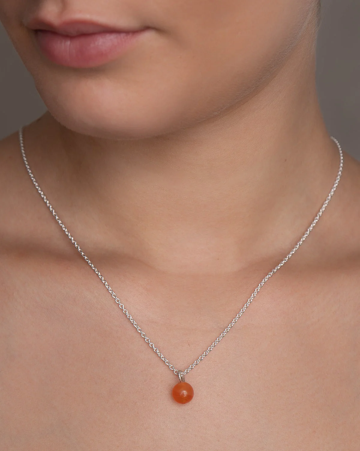 Globe anheng i sølv med den varme og dype, orange carneol. Carneolen og sølvets klare farger skaper en flott og lekende kontrast, som framhever hudens naturlige glød.