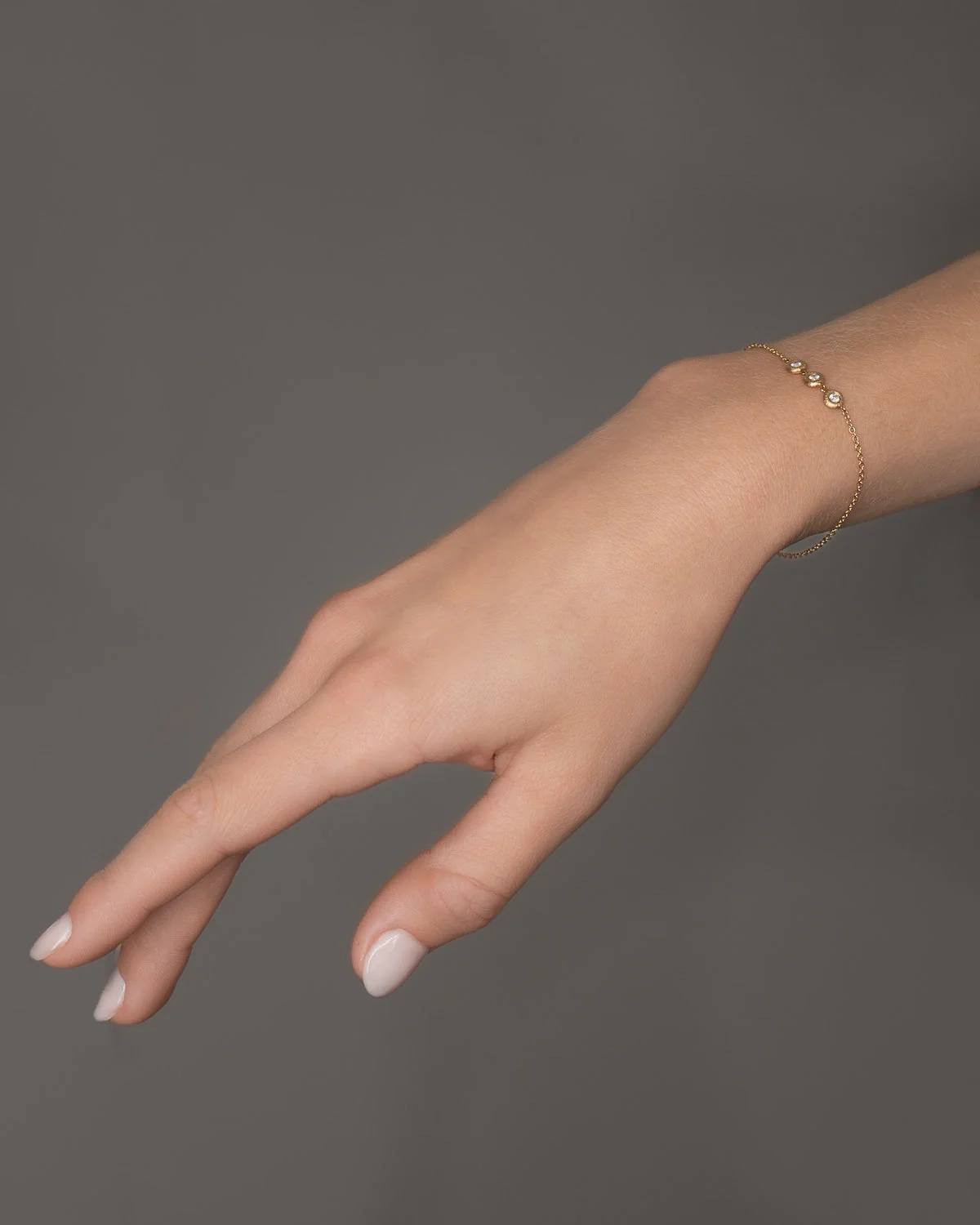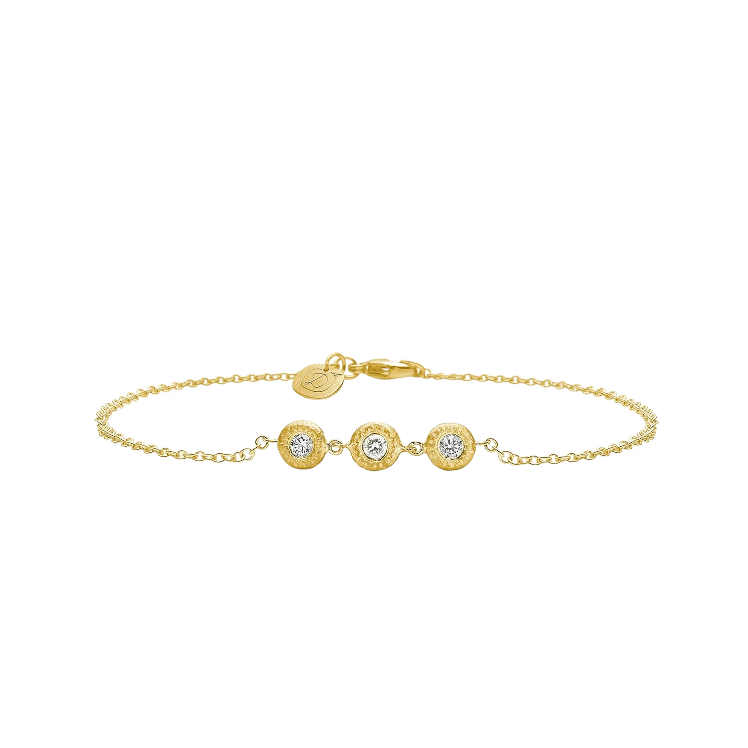 En delikat rekke av tre små brillantslipte diamanter satt i en lett og elegant rund anker kjede. Hver diamant er fattet i en sirkel av 18K gull av Dulongs dyktige gullsmeder. Gullets håndfilte, riflede overflate gir armbåndet en skjønn forening av et rått og et glamorøst uttrykk.