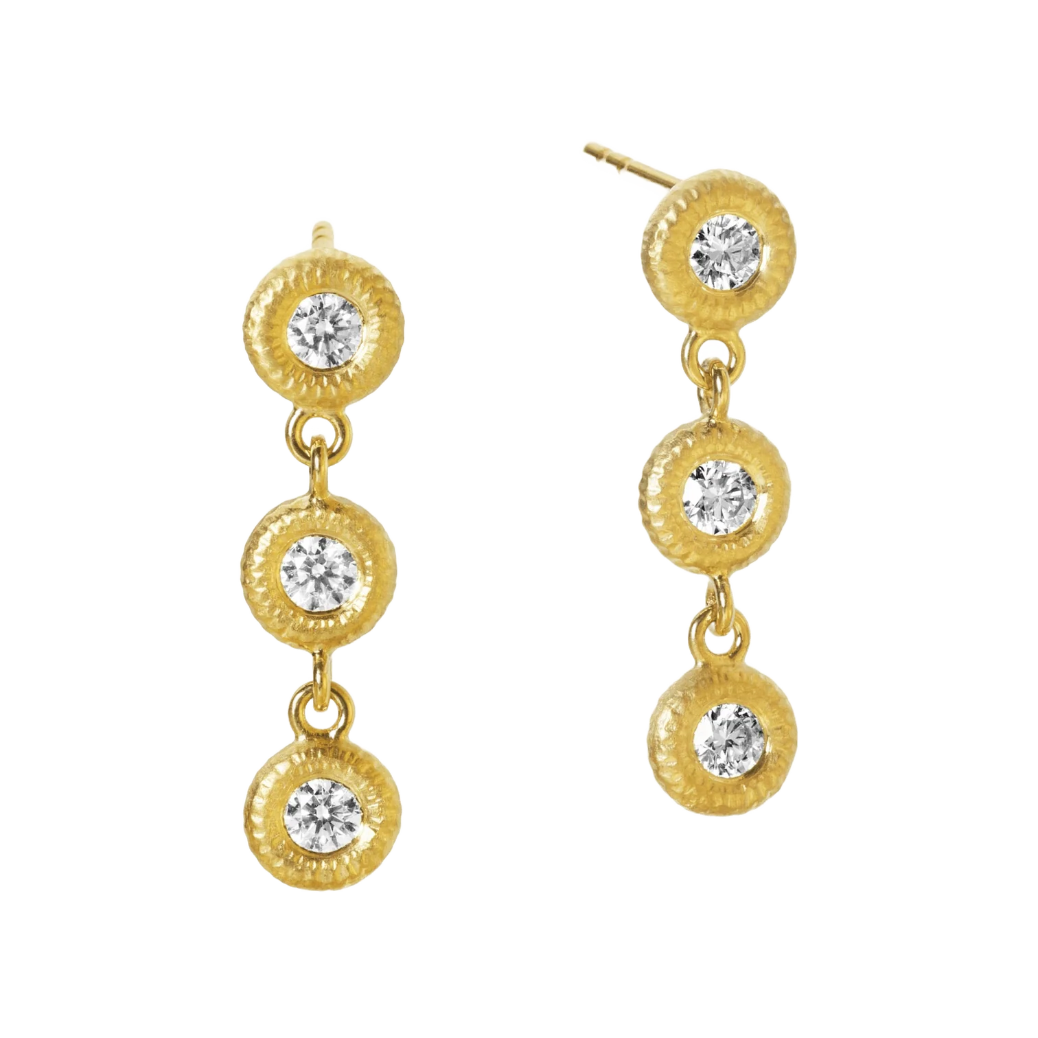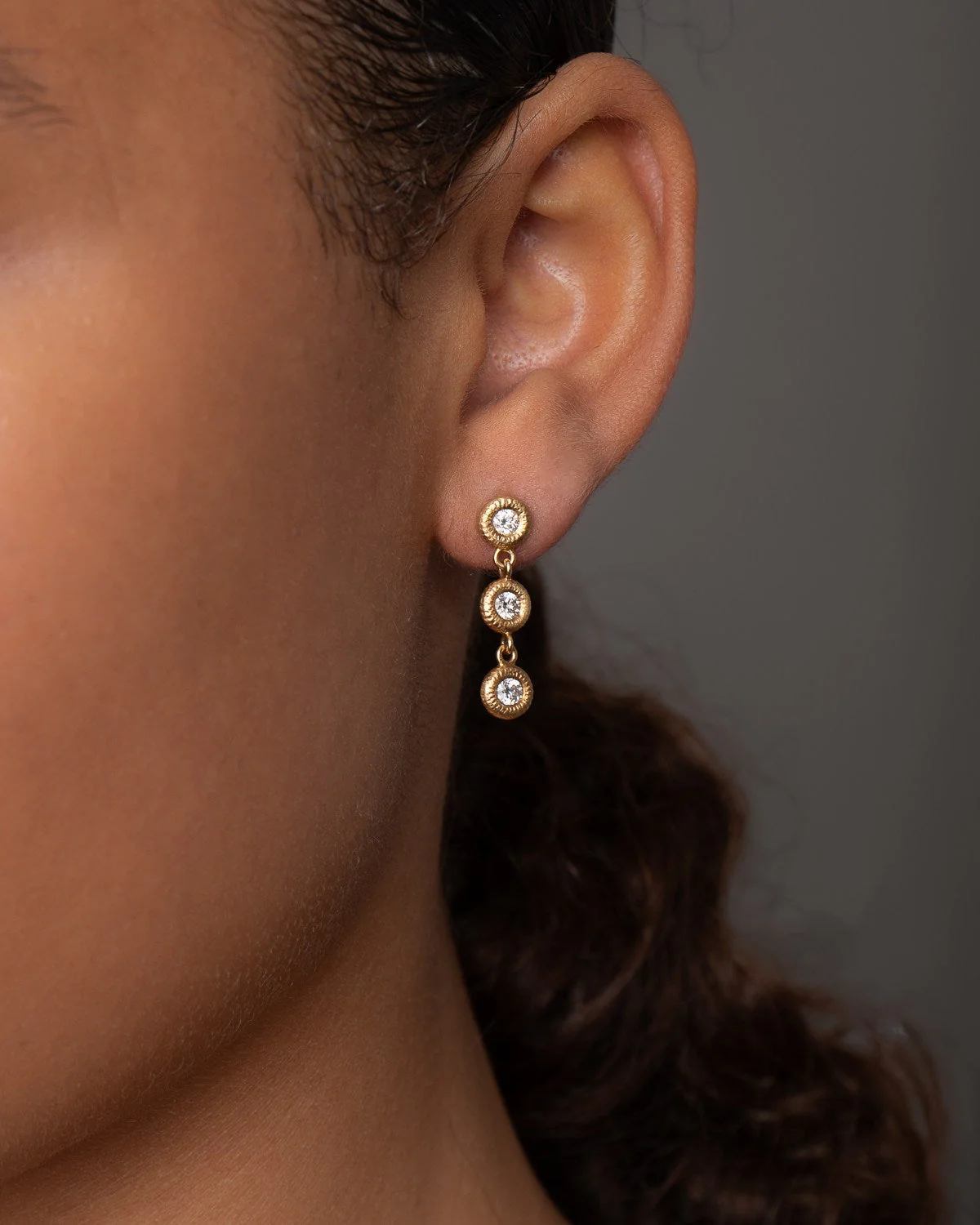 De 3 brillanter i Glory ørepynten er omkranset av sirkler med den karakteristiske håndfilte Dulong overflaten i edelmetallet. De flotte  ringene fremhever diamantenes naturlige ild, som også kan beundres på baksiden av ørepyntene. Glory ørepyntenes elegante enkelhet gjør de glamorøse både til hverdag og fest.