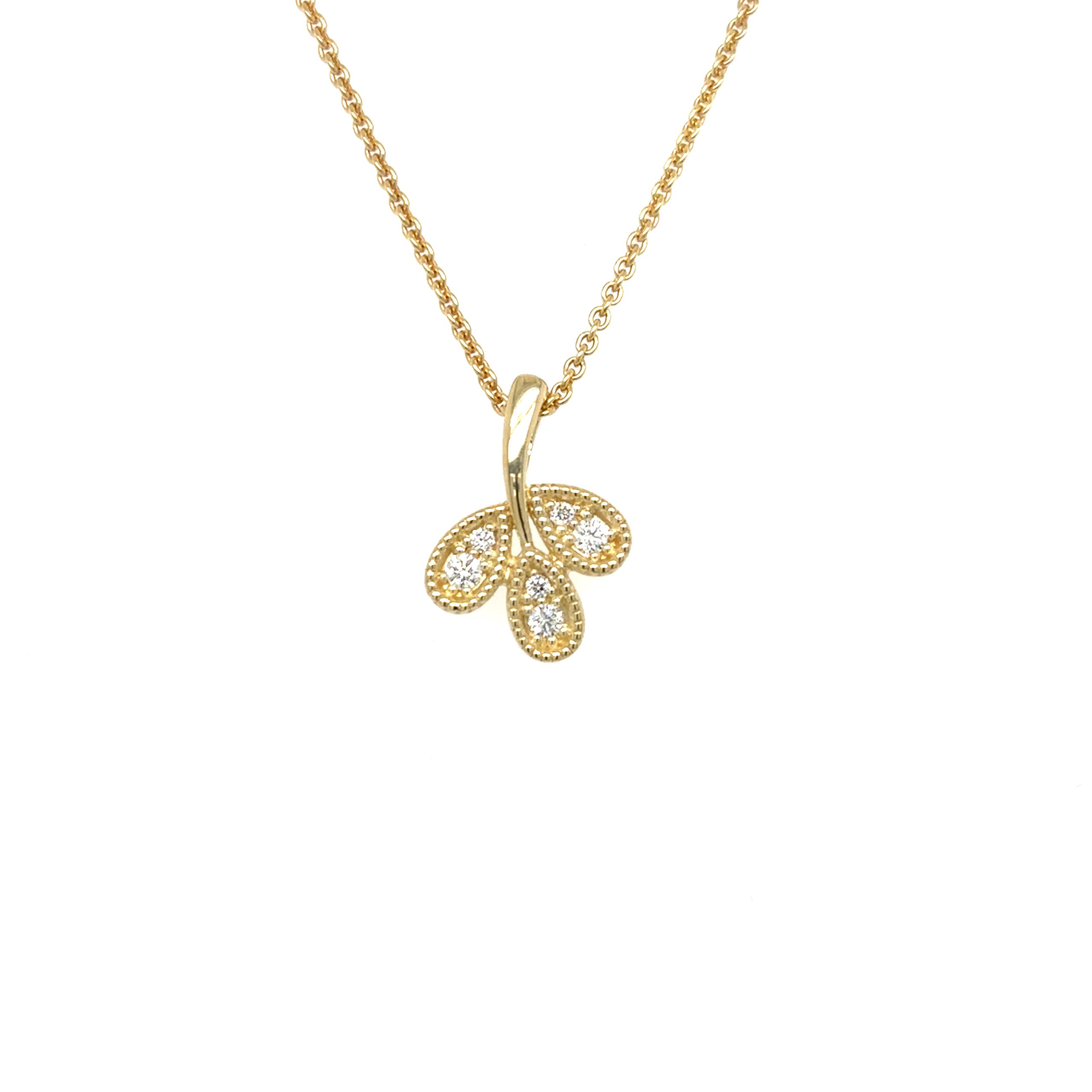 Gult gull anheng, 3 blader m/ 6 diamanter totalt 0,09ct W Si. Høyde: 14mm