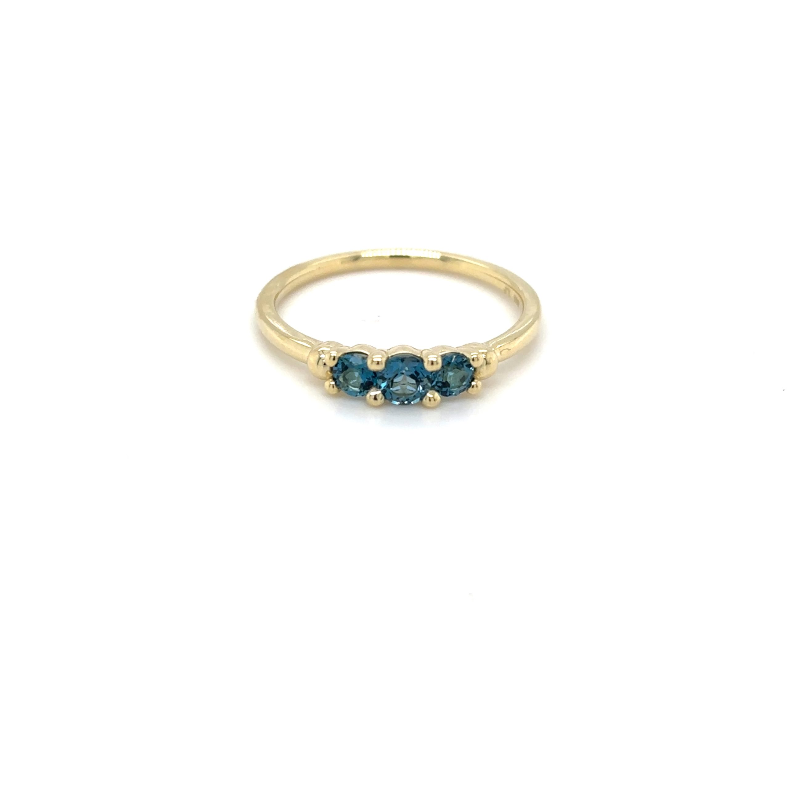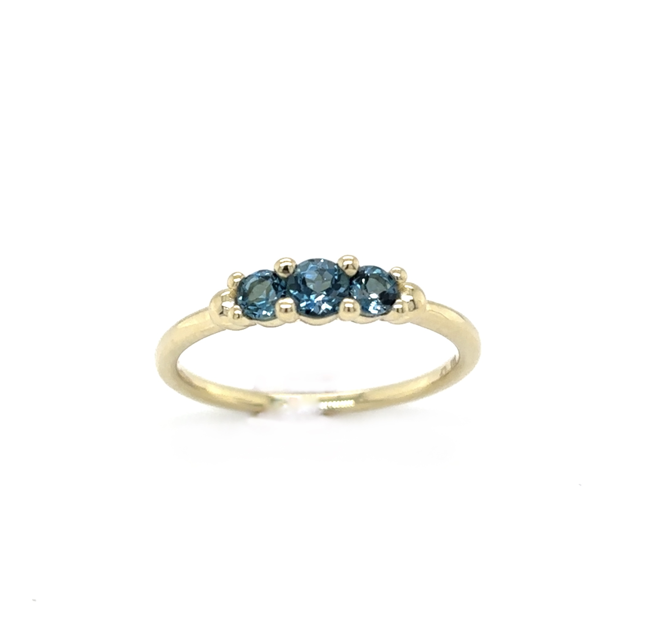 14 K Gult gull 3 stens ring m/ 3 London Blue Topaz, tot. 0,50ct ( 0,20 + 2×0,075ct)