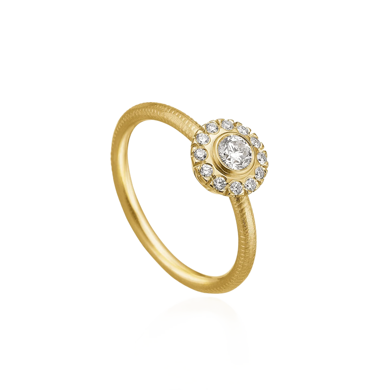 18K gull ring med 13 brillanter. I alt 0,33 ct. 1 x 0,23 ct. F/G, vs2, Ex. cut. 12 x 0,008 ct. F/G, vs, Ex. cut