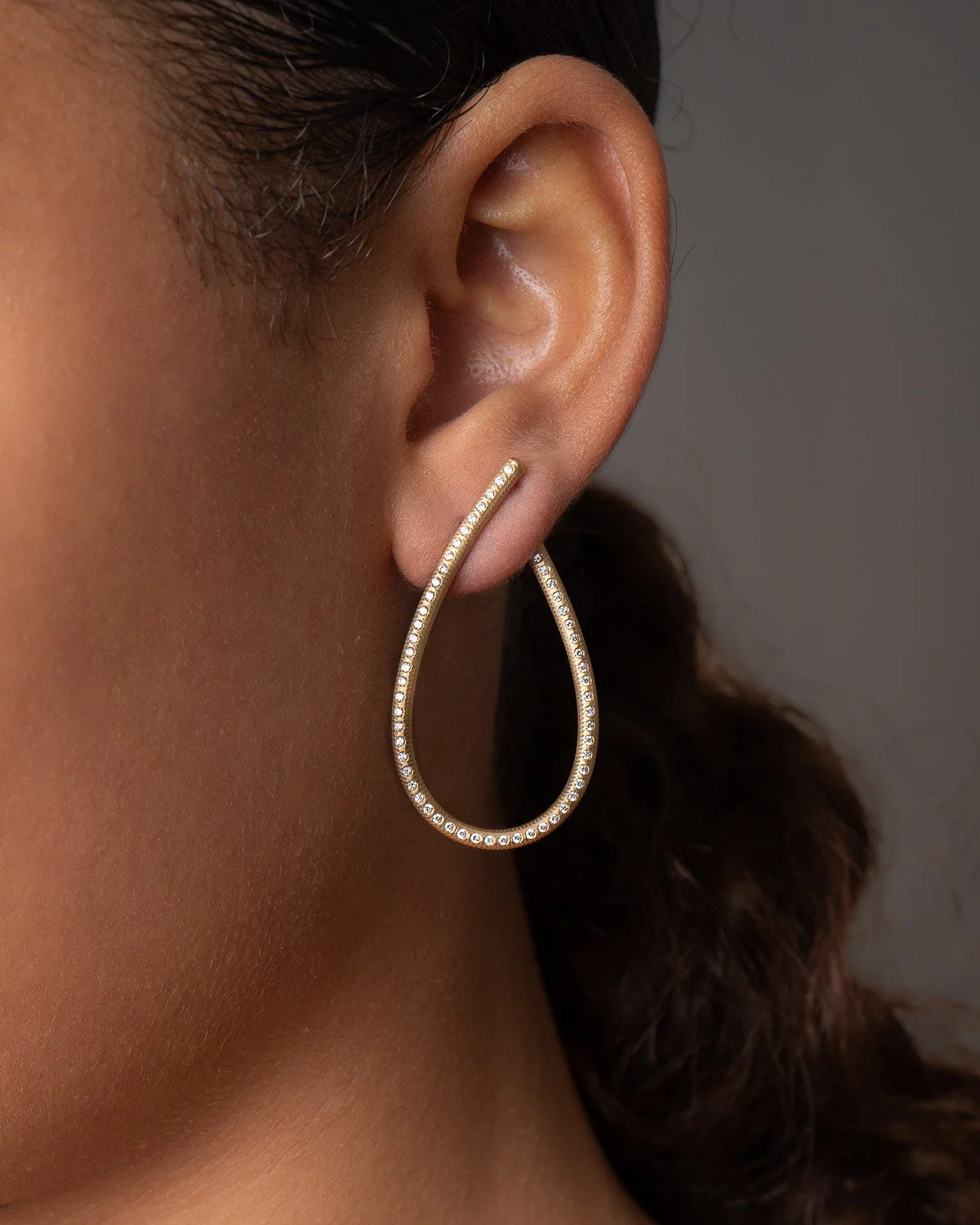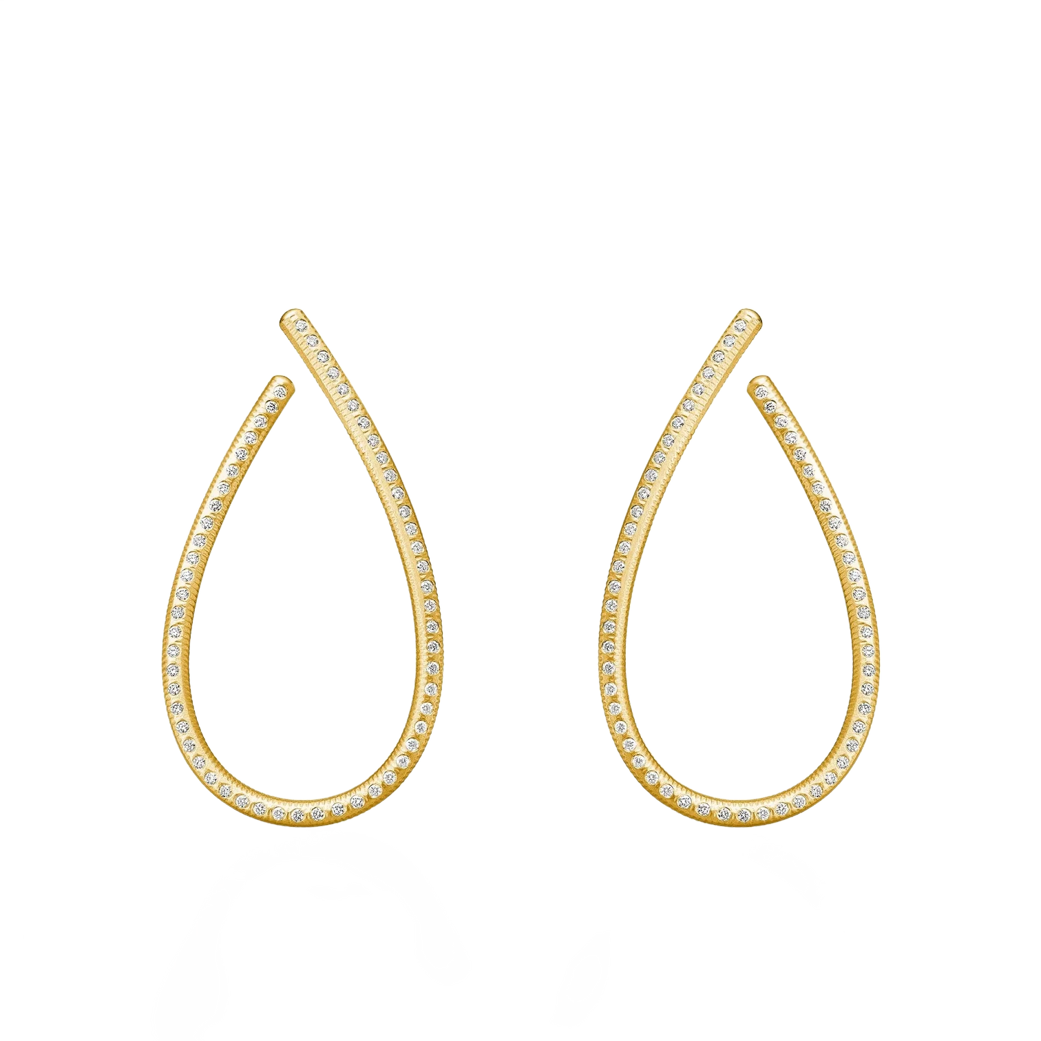 Guldsmedene har gitt øreringene Dulongs håndfilte, riflede signaturoverflate, som gir en rå kontrast til de eksklusive brillantslipte diamantene