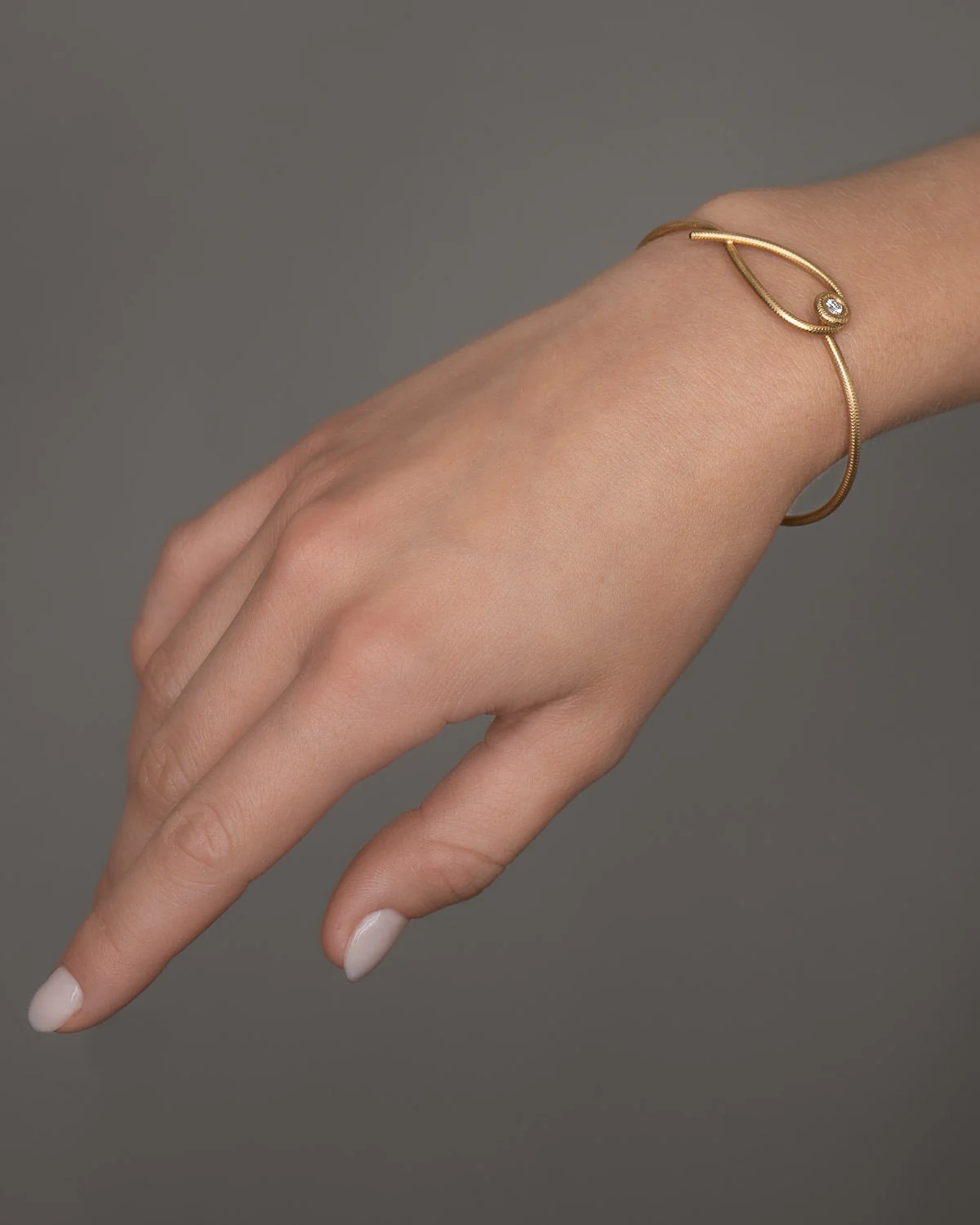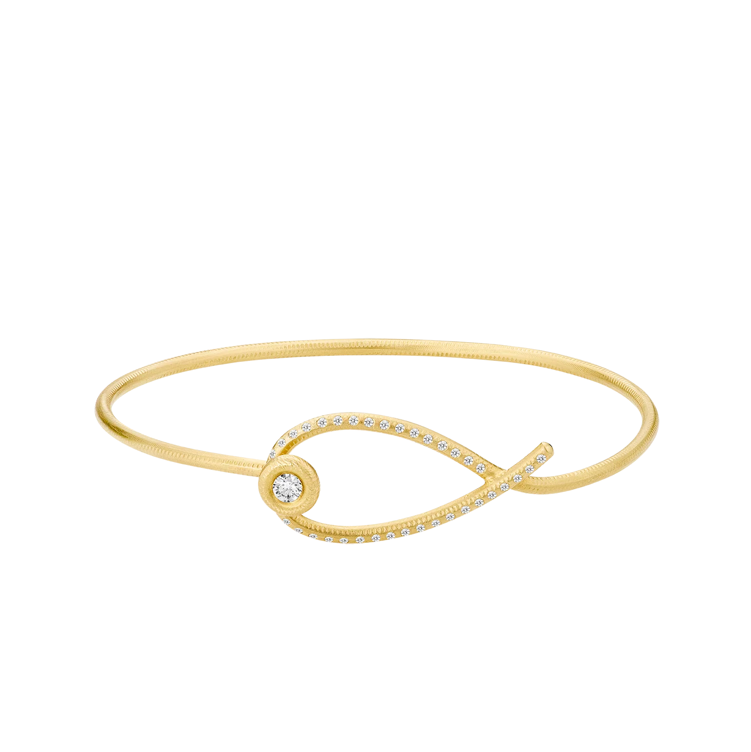 På den lekre armringen utgjør Kharisma øreringenes kurve en karakteristisk lukning, som holder armringen på plass og gir en perfekt pasform. Armringens overflate har Dulongs håndfilte, riflede signaturoverflate og en svevende diamant på 0,13 ct., som er central for Glory kollektionens smykker