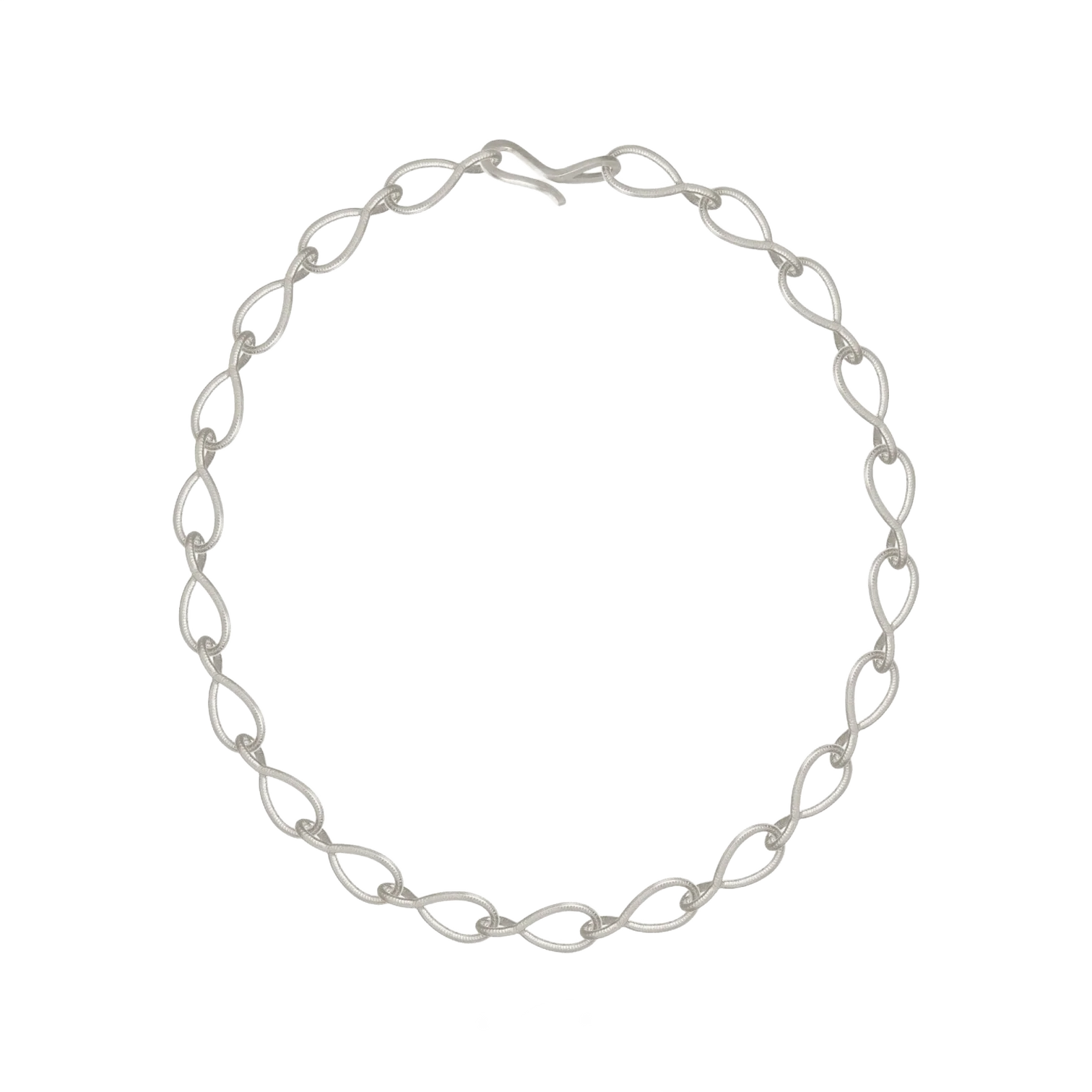 Den karakteristiske Kharisma-kurven er her tolket som et skulpturelt halskjede i stor skala – et kraftfult sølvkjede, som hviler lett og voluminøst om halsen. Designet balanserer det strukturelle og det organiske i en form, som fanger halsen med både styrke og lettet.