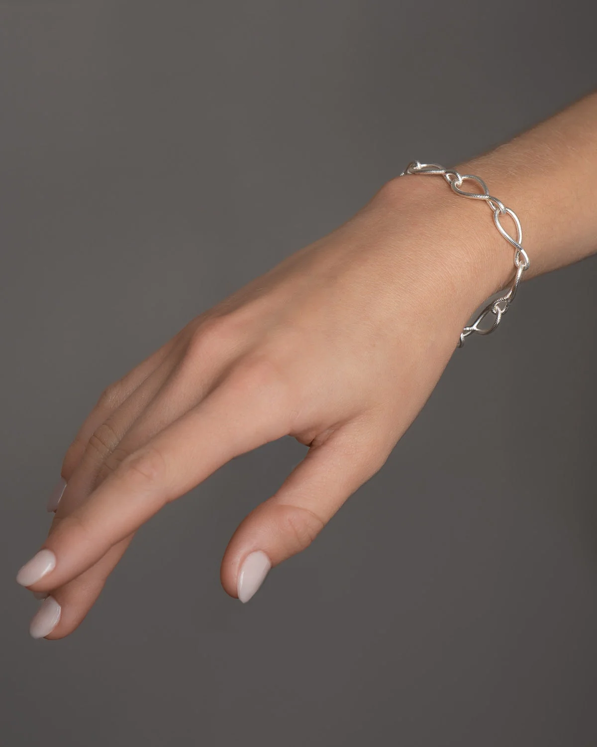Kharisma Link armbåndets store åpne ledd er formet, så de følger håndleddets form. Lenkearmbåndet faller derfor flott på armen og er behagelig å ha på. Overflaten er håndfilt og riflet som på de øvrige smykkene i Kharisma kolleksjonen. Armbåndet lukkes med den unike Dulong låsen.