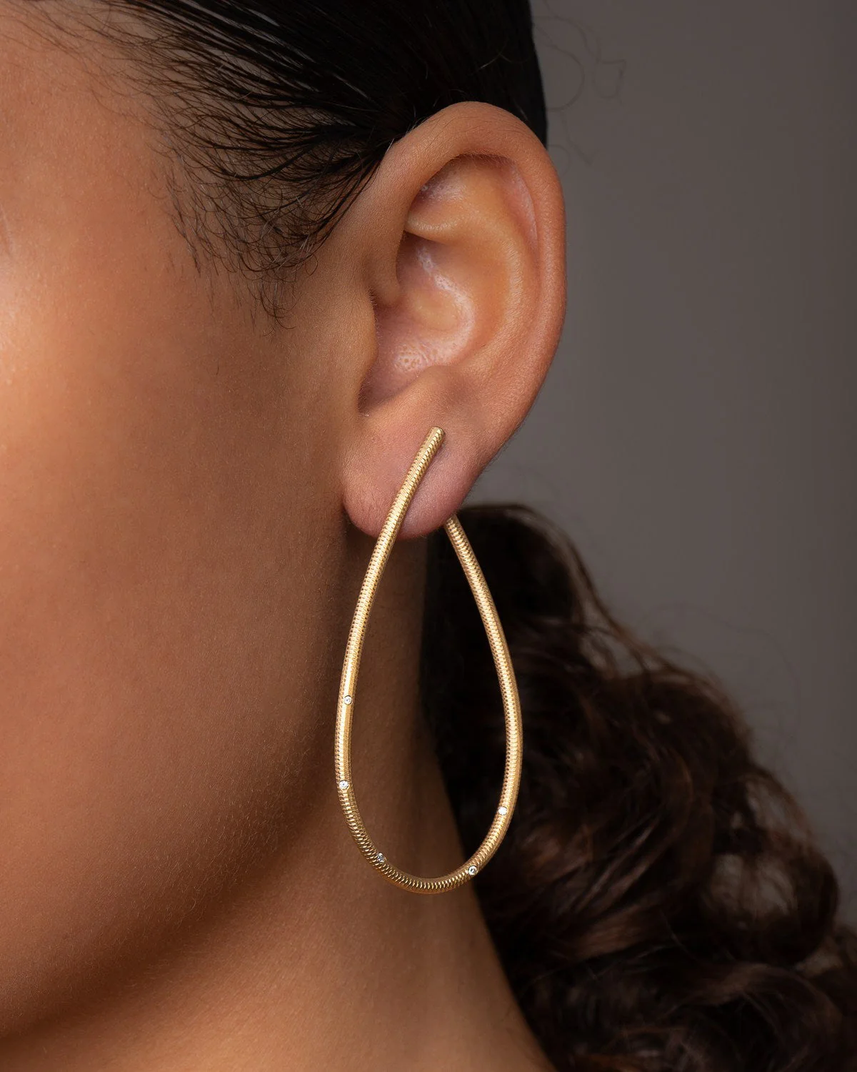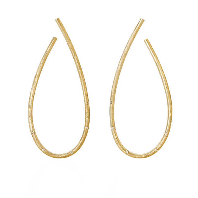 I den store størrelse er kurven perfekt dråpeformet. Kharisma øreringene kommer i fire forskjellige materialer: 18K gult gull, 18K hvitt gull, oxidert sølv og sølv, samt i fire forskjellige størrelser, med eller uten brillanter.