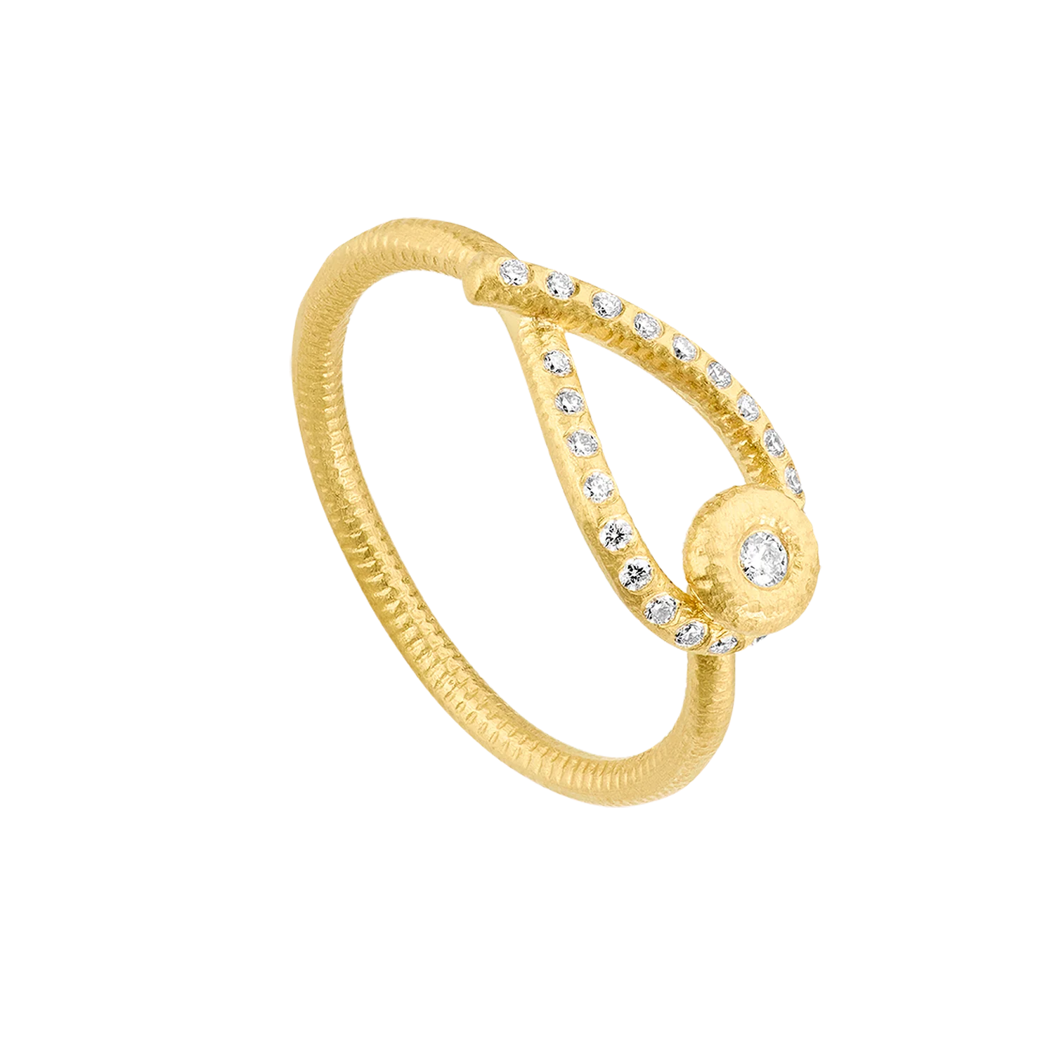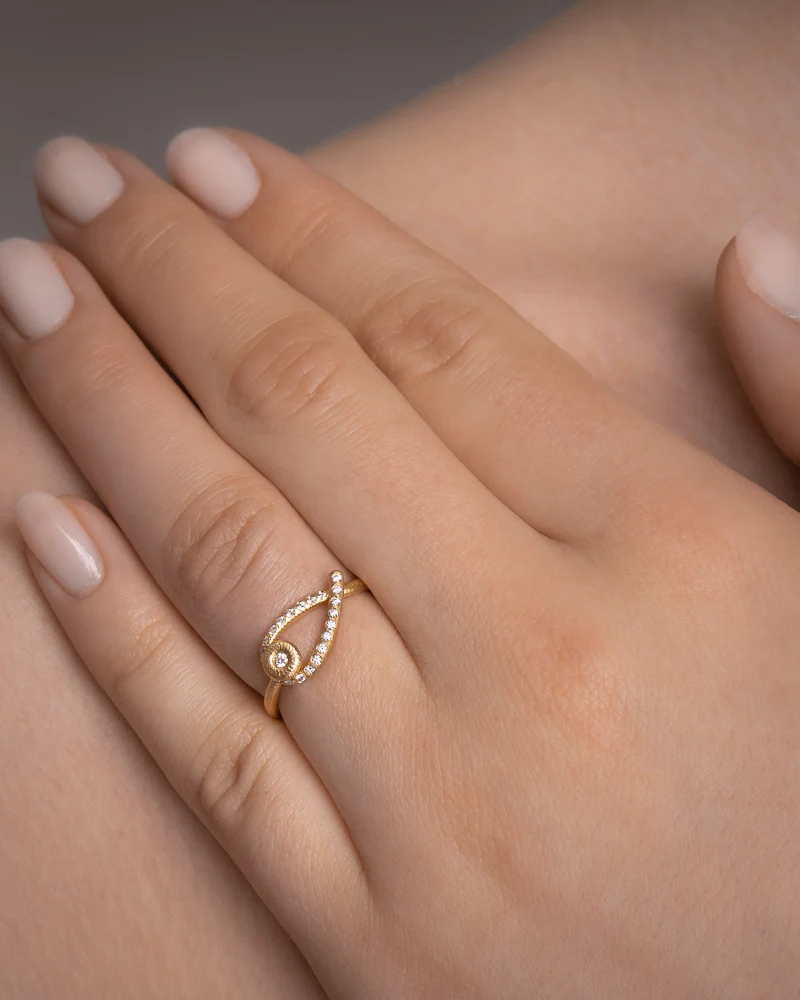 Kharisma ringen er skapt i et tidløst og glamorøst design. Den flotte kurven er ikonisk i sin enkelhet. Den håndfilede og silkematt gull  overflaten følger bevegelsen i smykket.