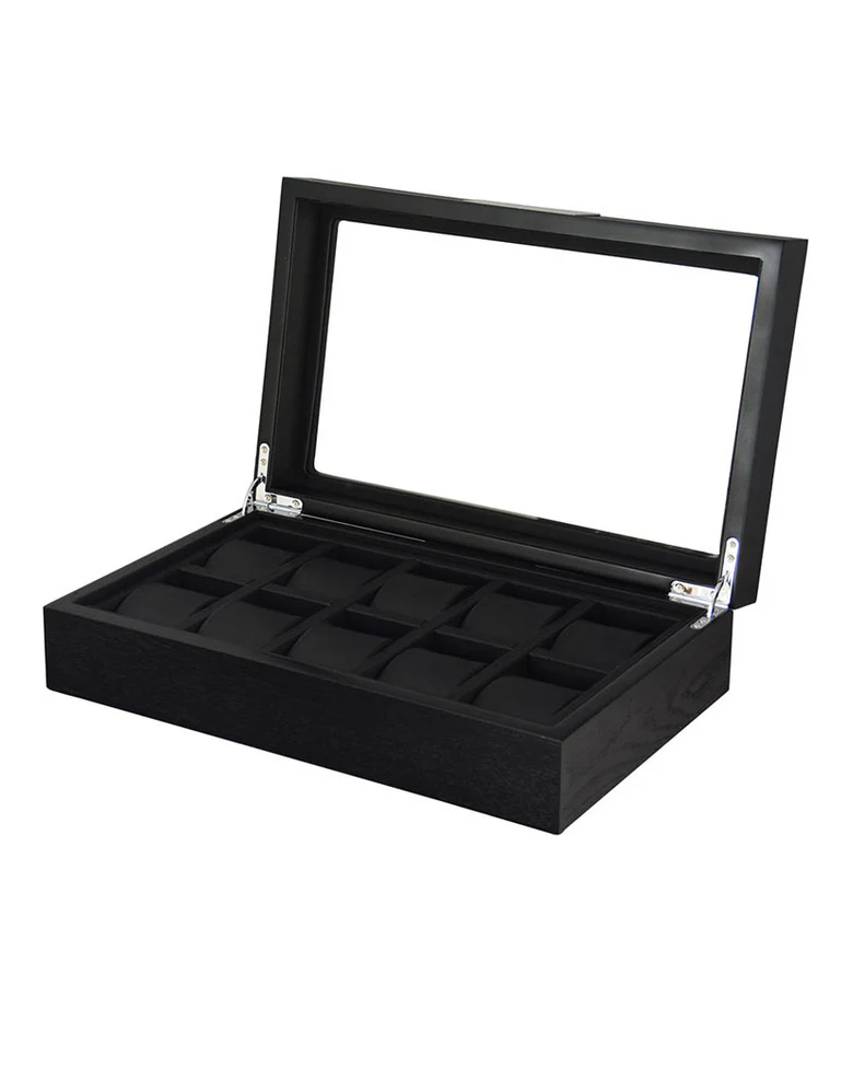 En praktisk og fin svart klokkeboks til oppbevaring av 10 armbåndsur.