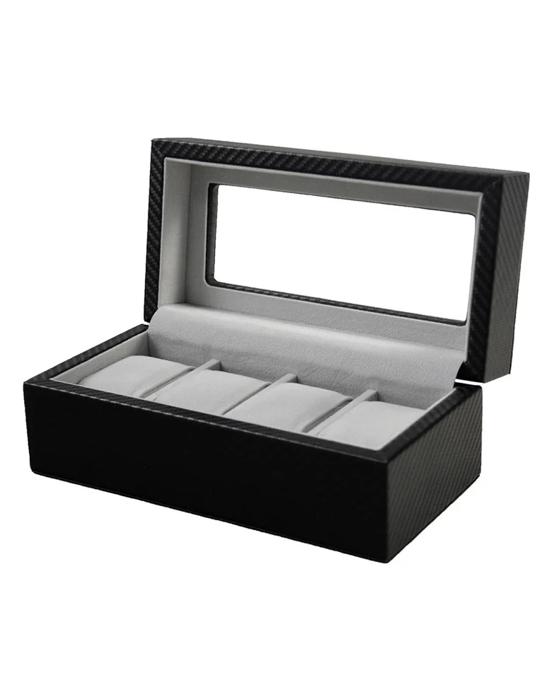 Organiser og vis frem dine armbåndsur med denne sorte, avlange klokkeboksen. Med 4 separate puter plassert side om side, holder boksen klokkene dine trygge og fri for riper. Det gjennomsiktige lokket gir deg full oversikt over samlingen din, samtidig som det beskytter mot støv og slitasje.