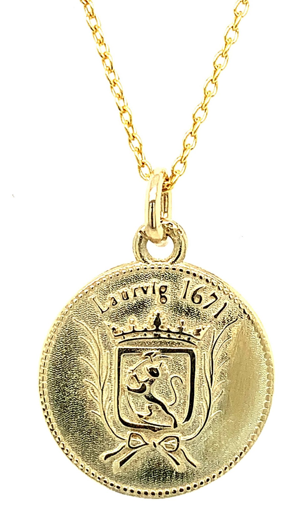 Mynten er laget i 14K gull med en diameter på 18mm. Pris er uten kjede.