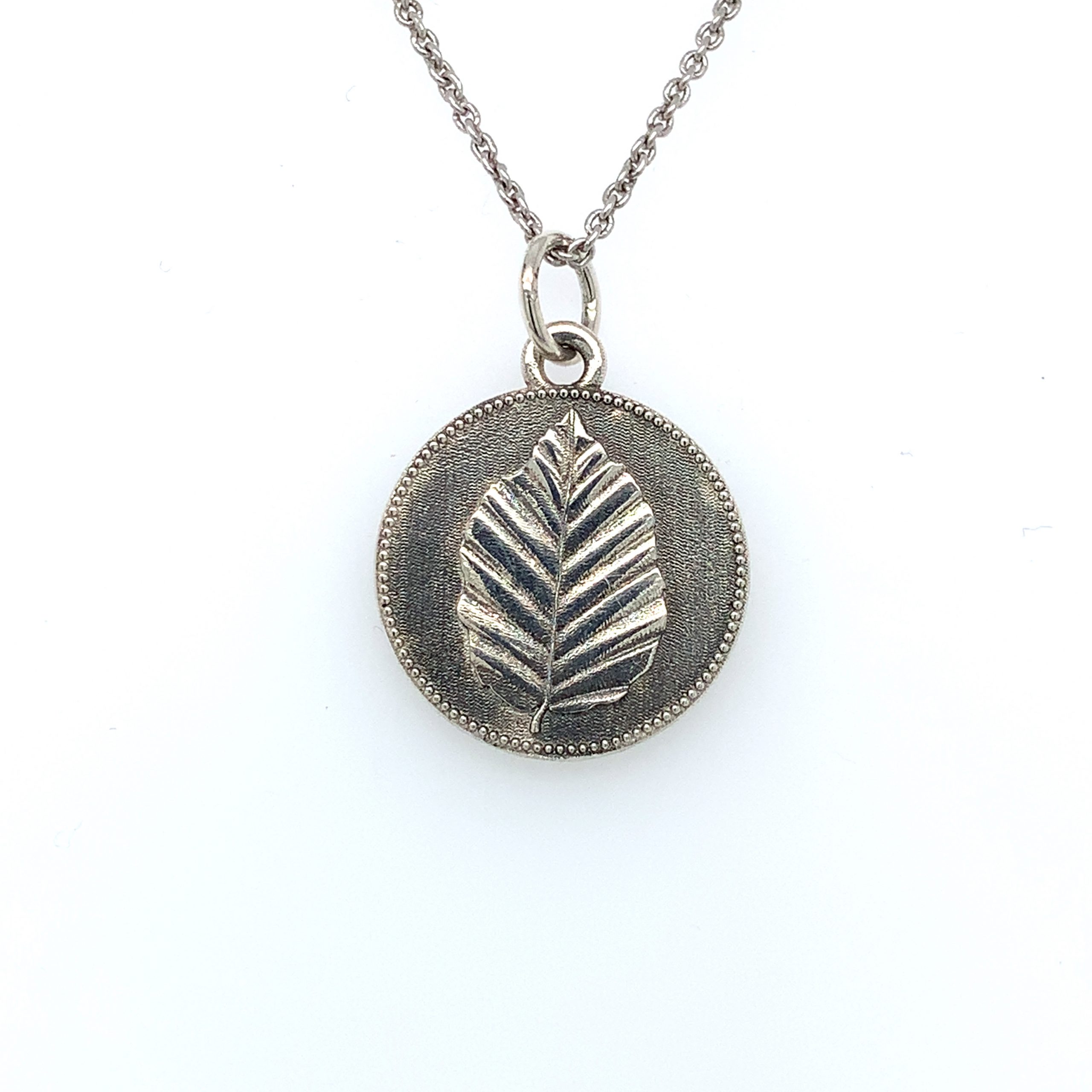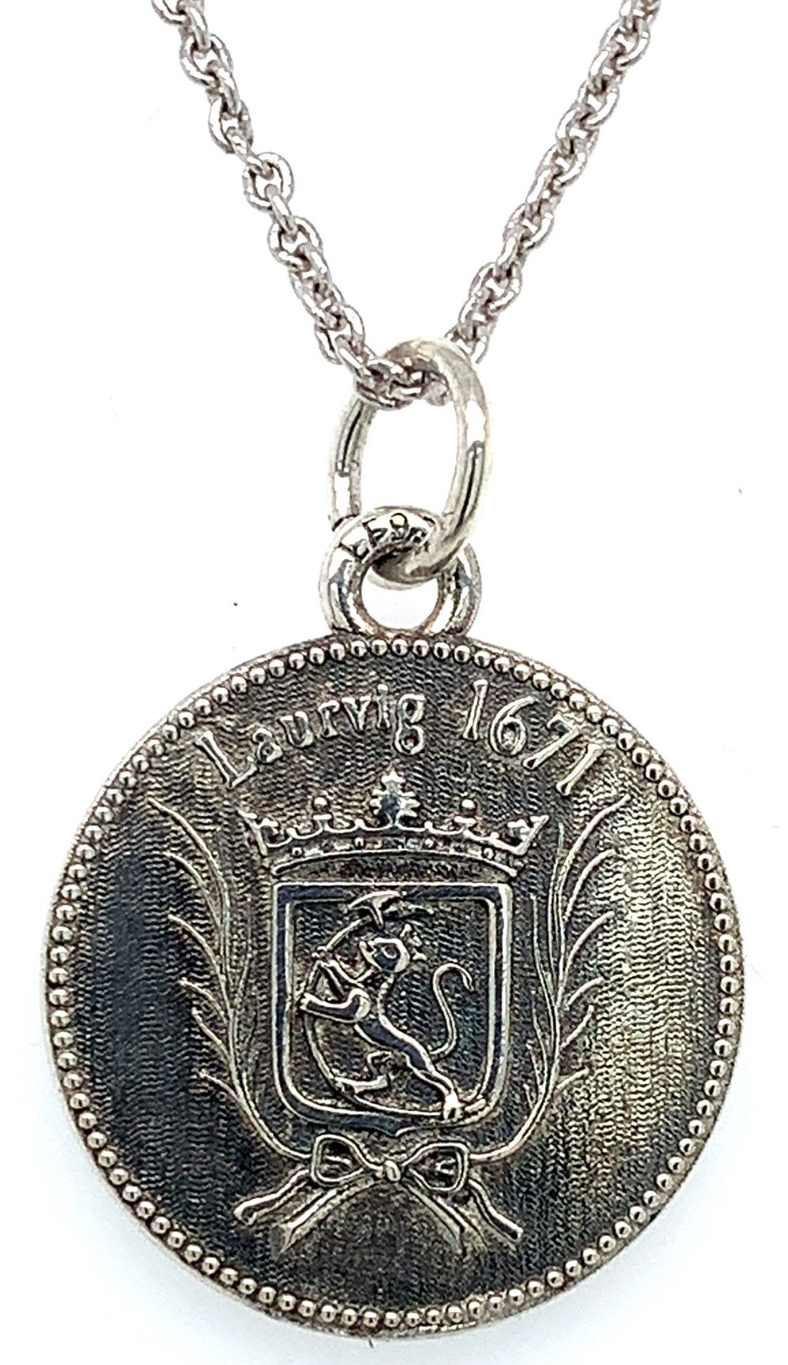 Mynten er laget i oksidert sølv med en diameter på 18mm. Mynten leveres med et rundt anker sølvkjede, med valgmulighetene 1,5mm kjede i 45 eller 50 cm eller i et 2mm kjede i 45 eller 50 cm kjede. Dette velges i størrelsefanen.