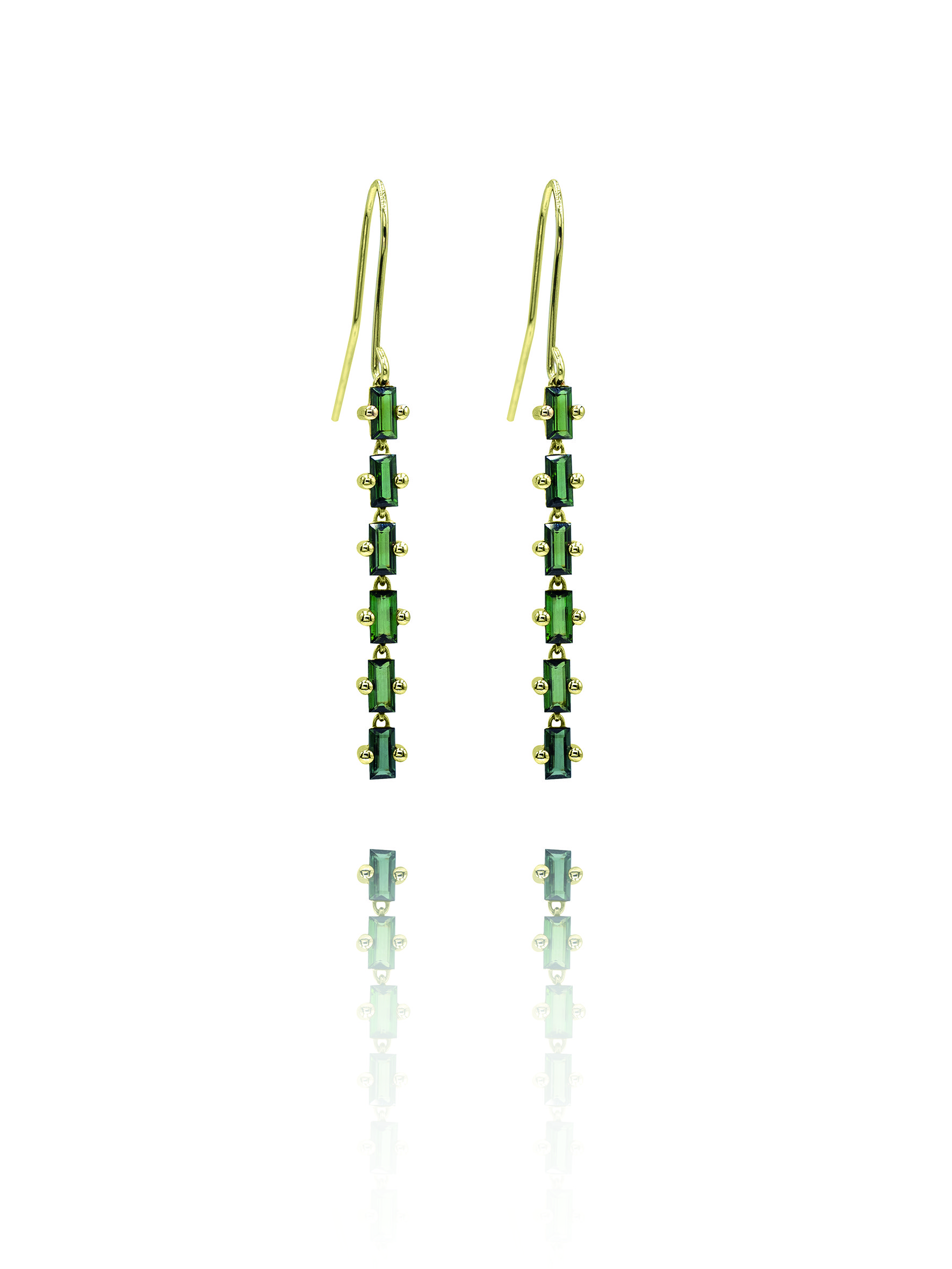 14K gull øreheng m/ baguettslipte grønne turmaliner. Krok mekanisme. Lengde 48mm ( fra topp av krok, 38mm stenparti) bredde4,5mm