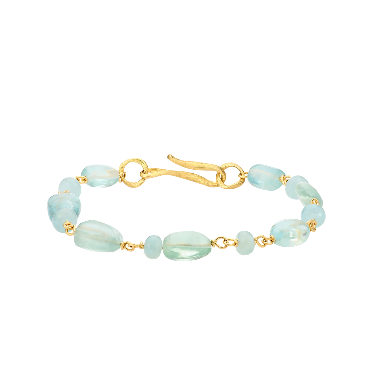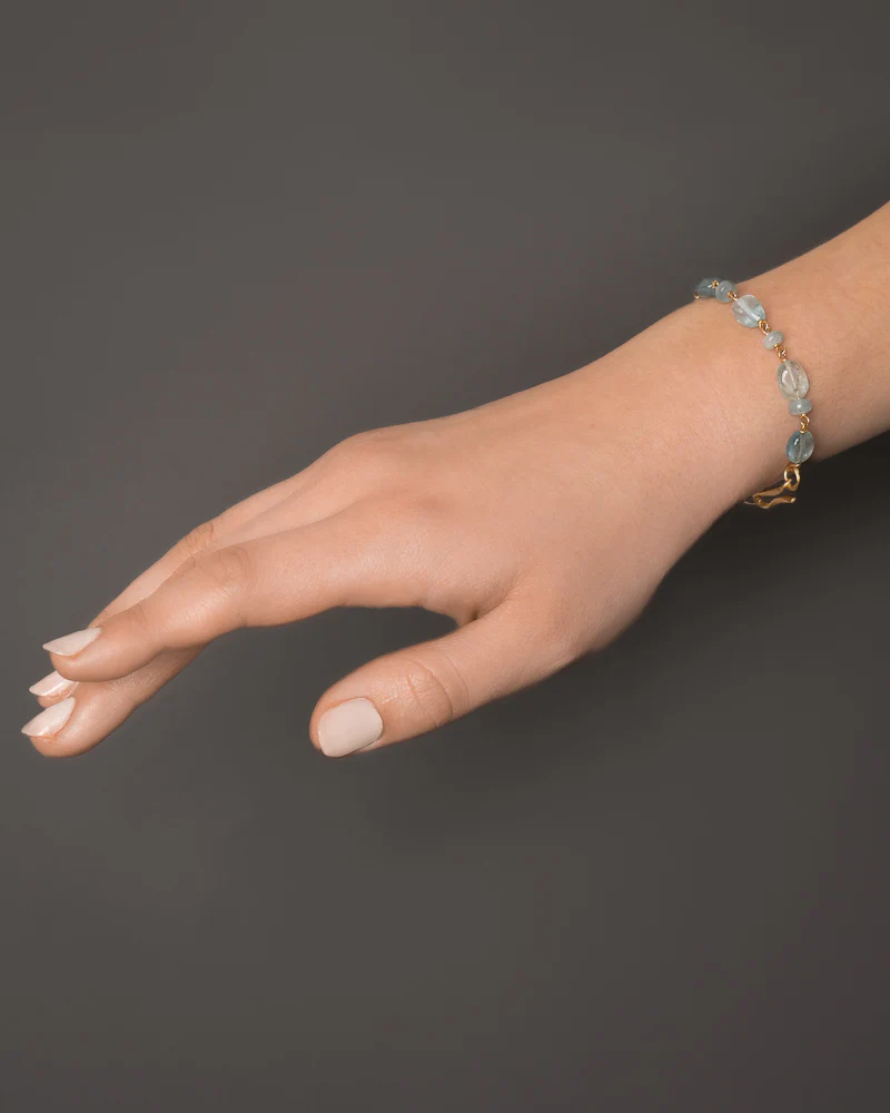 De sjeldne akvamariner er resultat av en tiårig kuratering av Marianne Dulong. Hver sten er utvalgt for sin størrelse, fargedybde og sin naturlige klarhet. Størrelse og individualitet gjør armbåndet sjeldent og begrenset i antal.