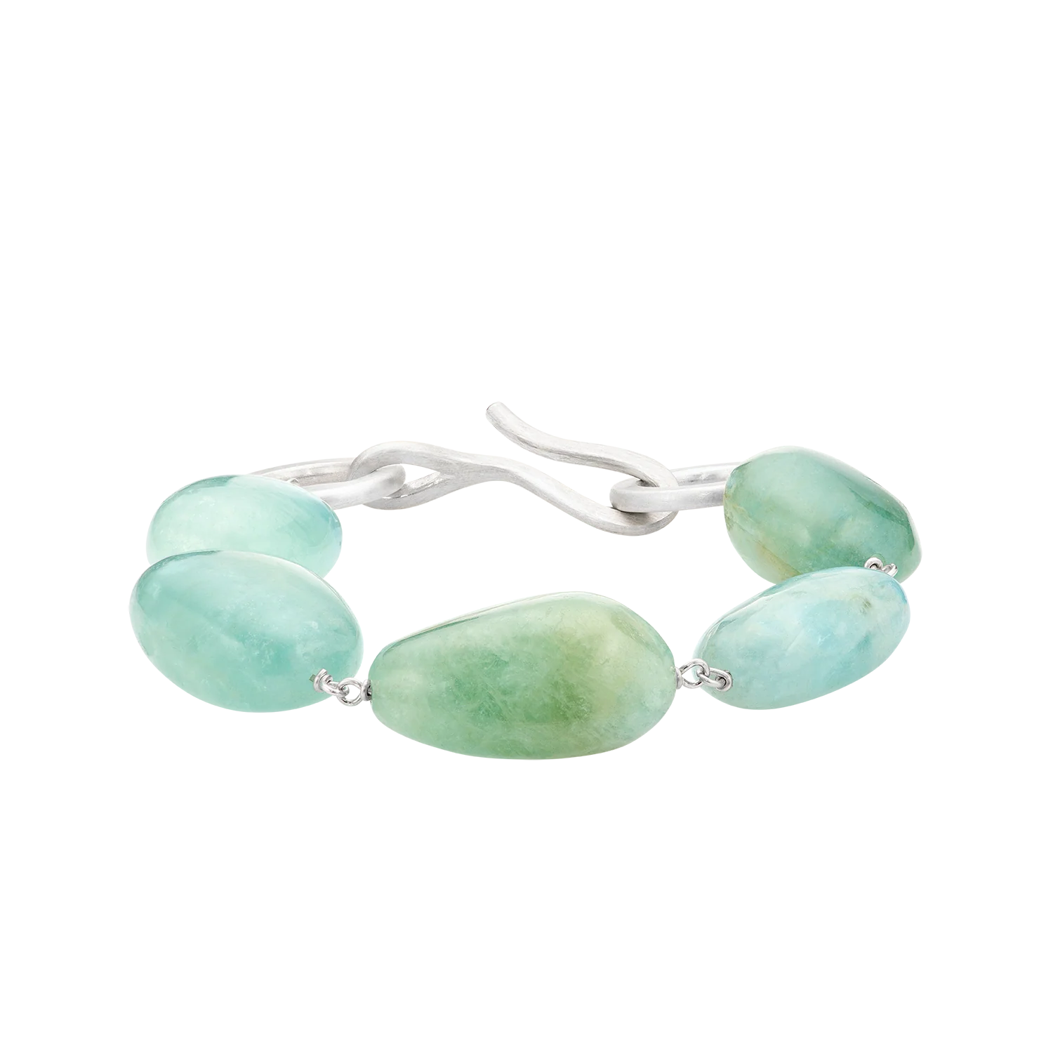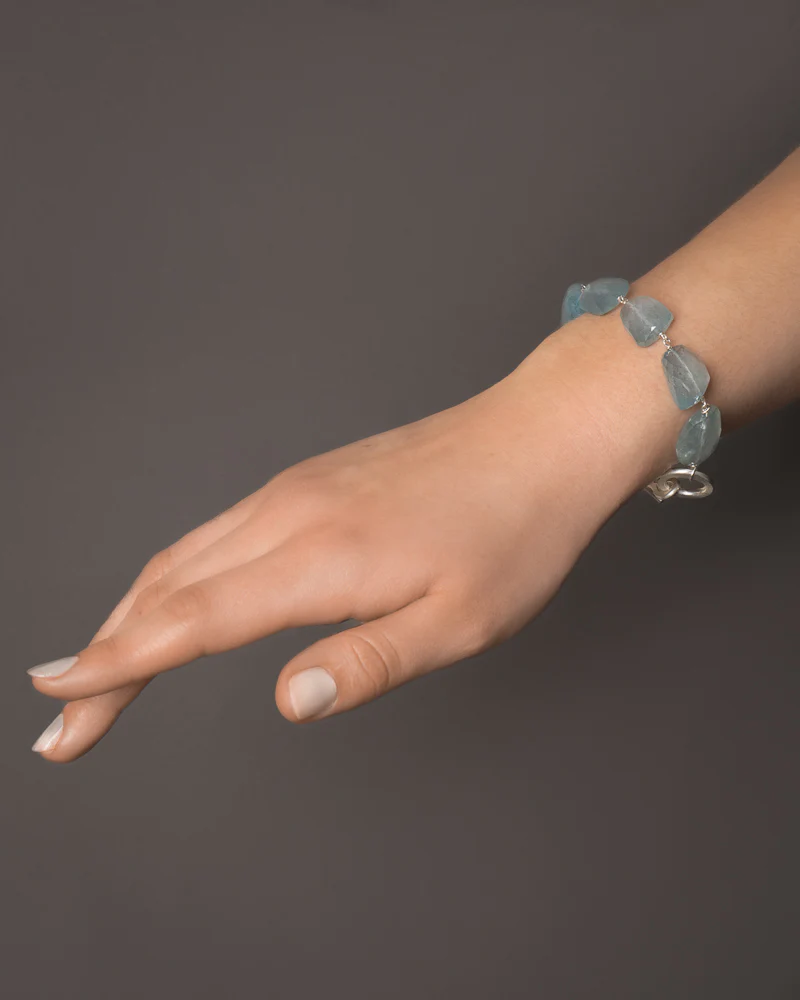 De sjeldne akvamariner er resultat av en tiårig kuratering av Marianne Dulong. Hver sten er utvalgt for sin størrelse, fargedybde og sin naturlige klarhet. Størrelse og individualitet gjør armbåndet sjeldent og begrenset i antal.