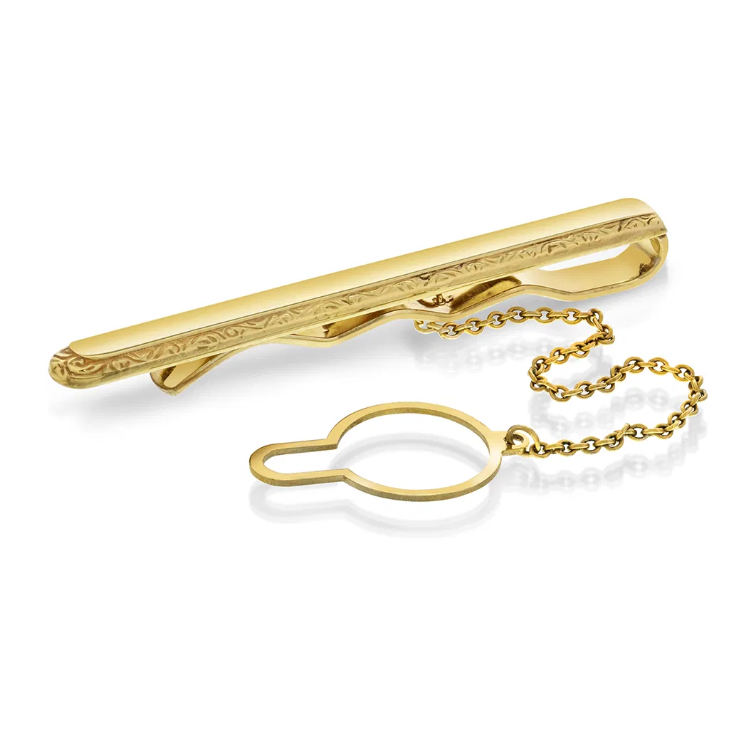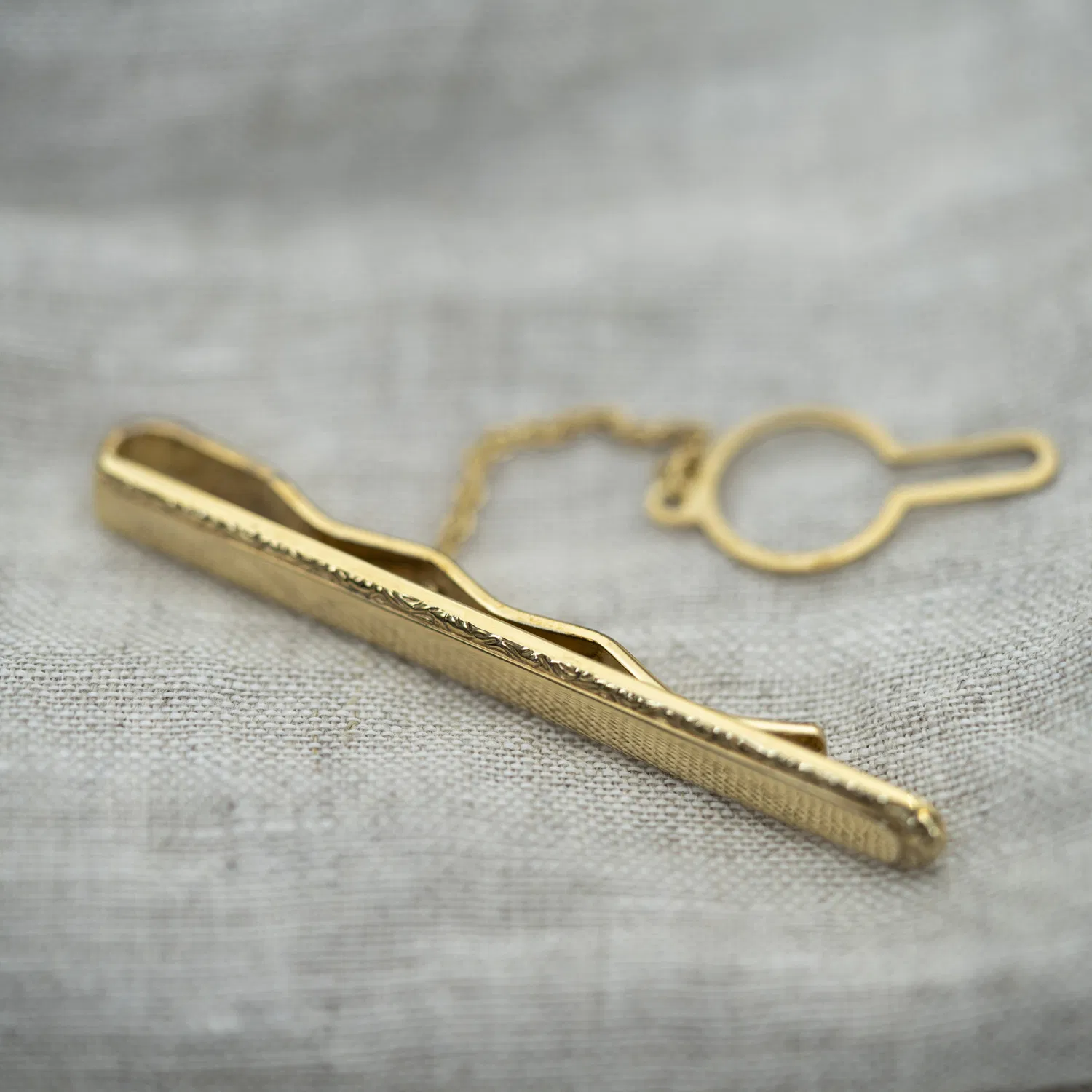 Gult gull slipsnål  sisselert. H:5 mm B:54 mm. Gull i front, mekanisme og sikkerhetslenke er double.