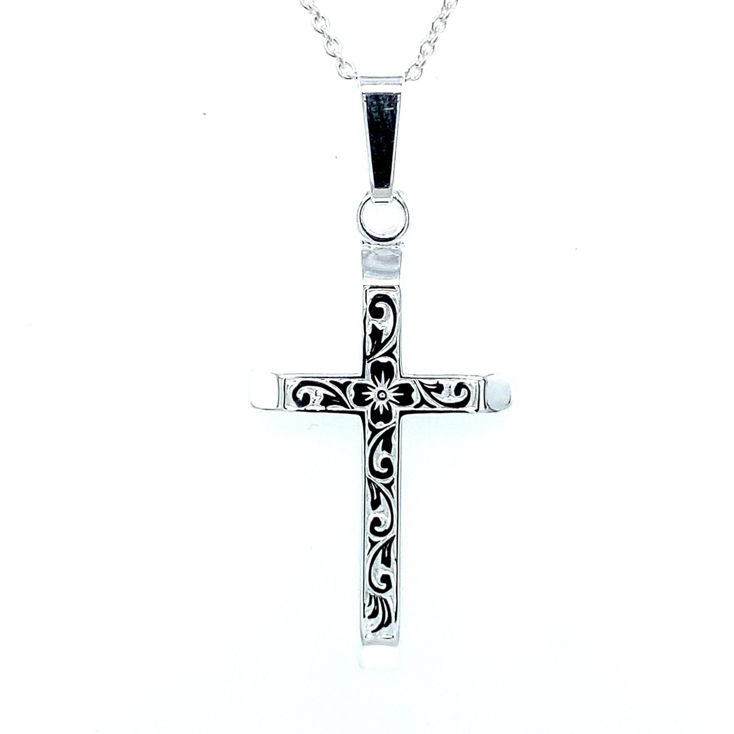 Sølv kors m/ blmostermønster i polert sølv 30 x 16 mm. Kjedet må kjøpes separat, ikke med i prisen